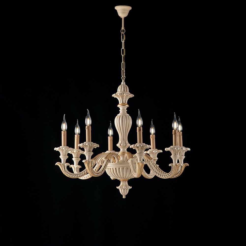 تُجسّد هذه الثريا الخشبية الكلاسيكية ، التي تُعبّر عن أناقة الحرفيين الإيطاليين، تحفة فنية حقيقية، قادرة على تحويل الضوء إلى عنصر ديكور آسر. يستحضر تصميمها المتقن، بأذرعها المتعرجة وتفاصيلها المنحوتة ، الطراز التقليدي للثريات القديمة، مُعاد ابتكاره بذوق رفيع.