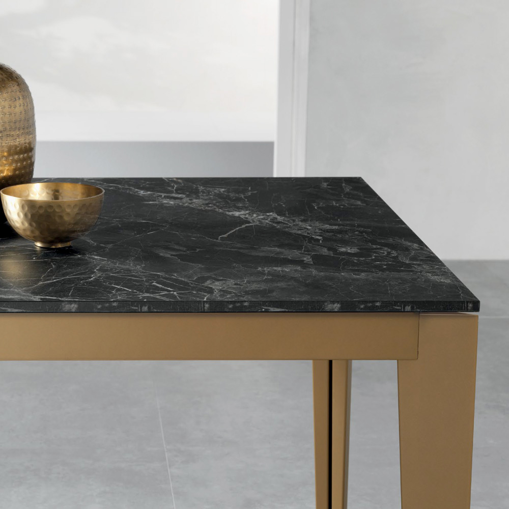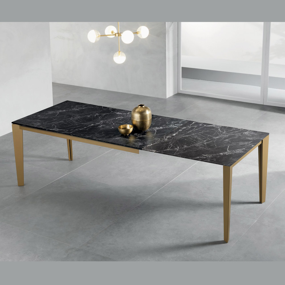 أنيقة وعملية، تجمع هذه الطاولة المستطيلة القابلة للتمديد بين التصميم العصري والعملية. سطحها العلوي المصنوع من صفائح الرخام الداكن بسمك 18 مم يُبرز دفء وأصالة الرخام، بينما تُضفي أرجلها المعدنية المطلية بالذهب العتيق لمسةً من الثبات والعصرية.