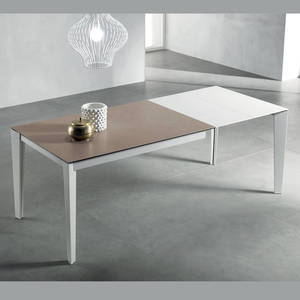 أنيقة وعملية، تجمع هذه الطاولة المستطيلة القابلة للتمديد بين التصميم العصري والعملية. سطحها الزجاجي الخزفي بسمك ١٠/١١ مم، بلمسة نهائية من فوكوس تيرا ، بينما تُضفي أرجلها المعدنية المطلية باللون الأبيض غير اللامع لمسةً من الثبات والعصرية.