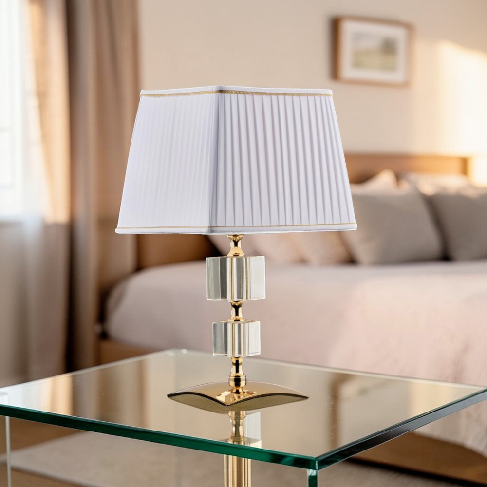 تتميز هذه المصابيح الفاخرة المصنوعة من الحديد المذهب والكريستال بأناقتها ورقيها، فهي تمثل توازناً مثالياً بين التصميم الكلاسيكي والذوق المعاصر. يتناغم هيكلها النحيل، المزين بعناصر كريستالية هندسية ، مع غطاء مصباح من القماش المطوي الذي ينشر ضوءاً ناعماً ودافئاً، ليخلق جواً أنيقاً وراقياً.