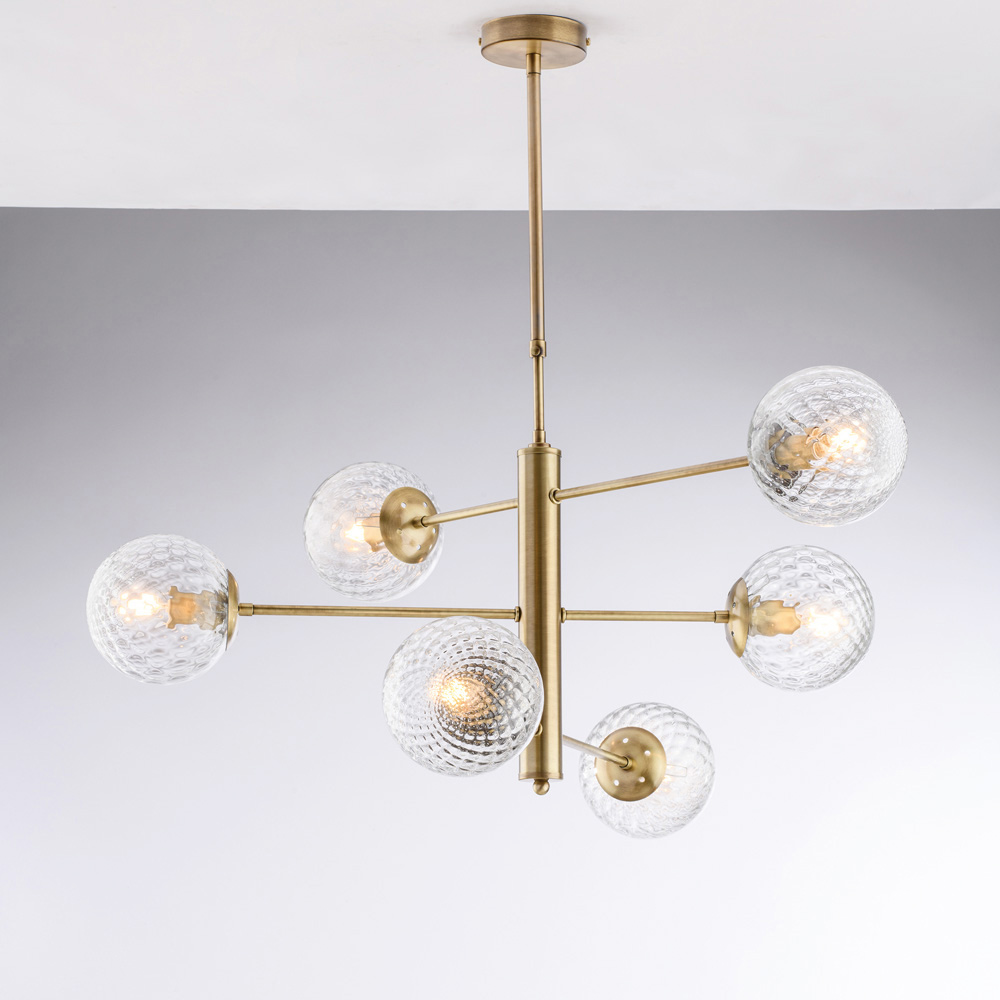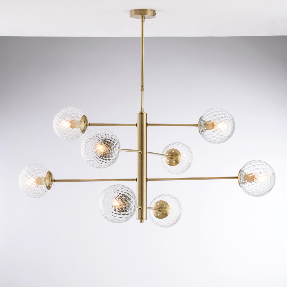 تتميز هذه الثريا الحديدية المصنوعة يدويًا بأناقتها وعصريتها، وتبرز بتصميمها الهندسي المتوازن. تدعم الأذرع الأفقية موزعات زجاجية كروية، مما يخلق تناغمًا راقيًا بين التناظرات، وينشر ضوءًا ناعمًا ومتناغمًا.