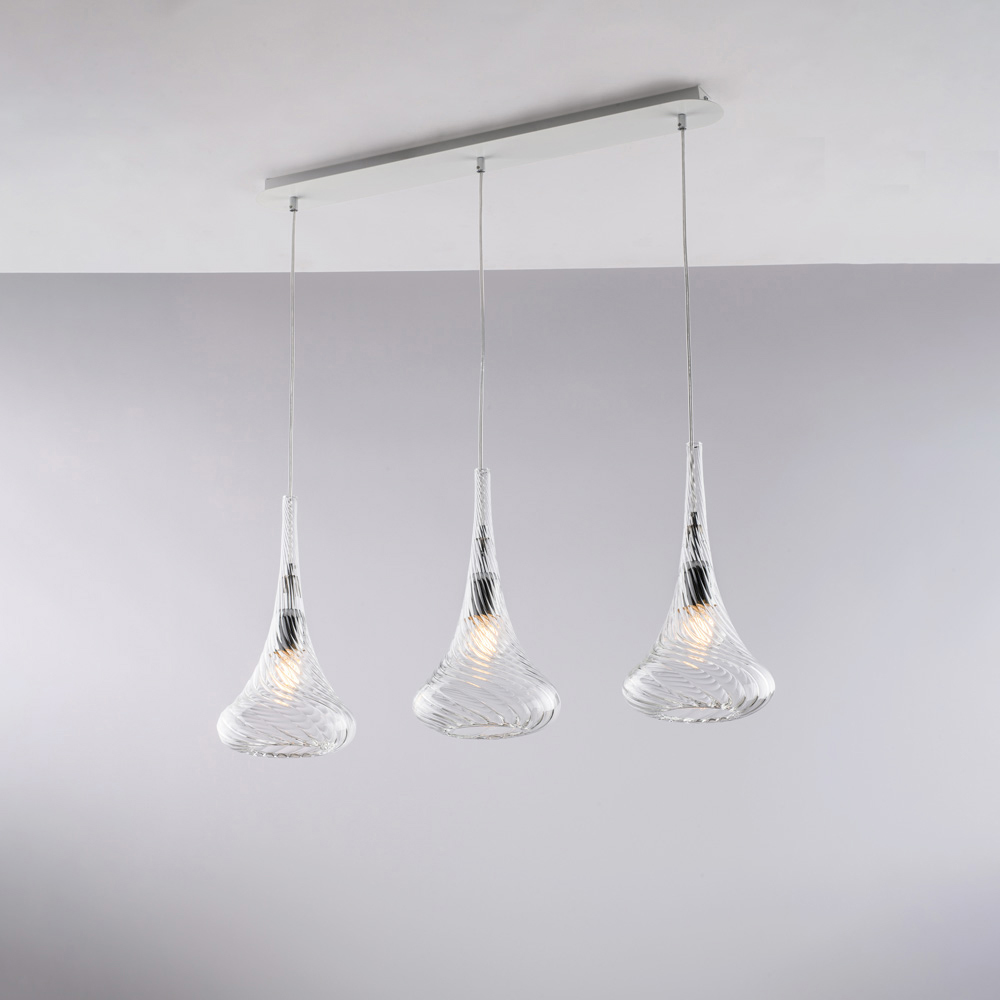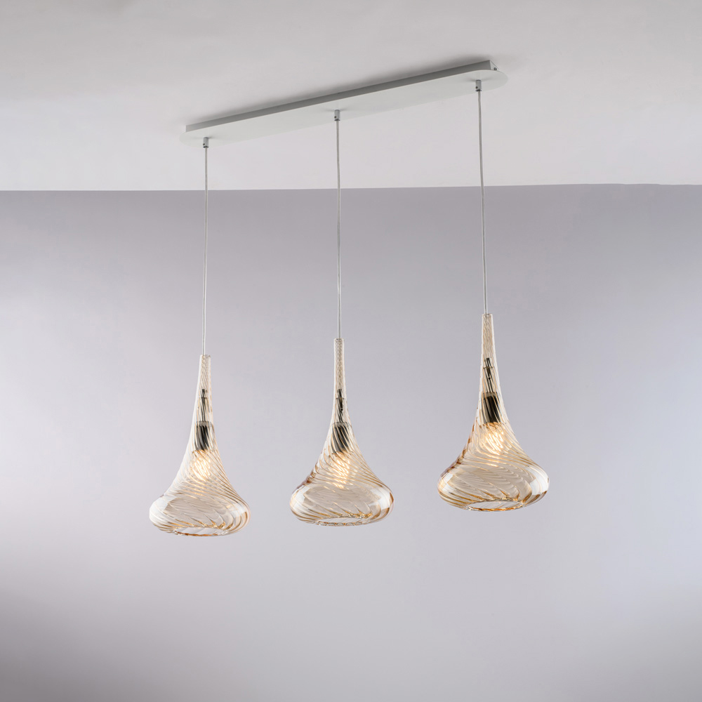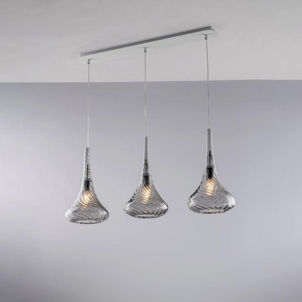 تتوفر هذه الثريا المعلقة بتشطيبات شفافة ، أو كهرمانية ، أو رمادية ، مما يتيح لك تخصيص أجواء مساحتك: مشرقة وبسيطة في النسخة الشفافة، دافئة وجذابة في النسخة الكهرمانية، وأنيقة وعصرية في النسخة الرمادية. إنها مثالية لجزر المطبخ ، وطاولات الطعام ، والأسطح ، والمساحات المفتوحة ، وبيئات التصميم التعاقدي .