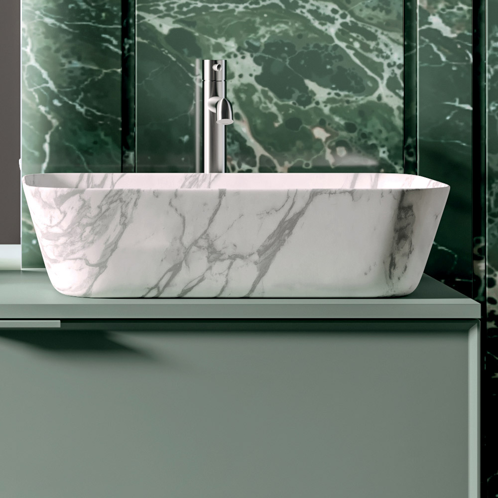 يُضفي حوض الغسيل المصنوع من السيراميك ذو تأثير كالاكاتا عنصرًا ماديًا ذا قيمة عالية، مع عروق دقيقة تُذكّر بالرخام الطبيعي وتُزيّن ديكور الحمام بأكمله.