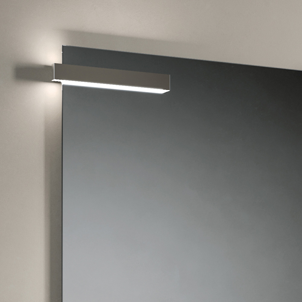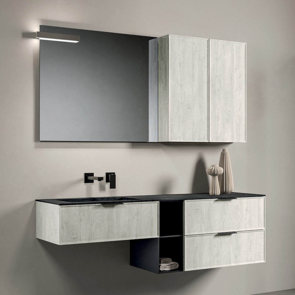 يكتمل التصميم بالمرآة المستطيلة ومصباح LED ، مما يضمن إضاءة وظيفية وسينوغرافية، مثالية لتحسين منطقة الحوض وتحسين الراحة البصرية.