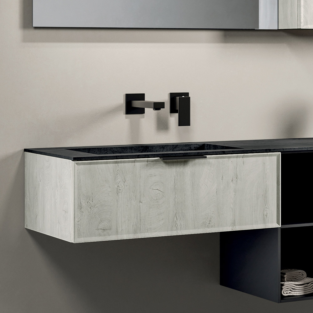 يُضفي السطح المزود بحوض مدمج من الخزف الحجري ذي المظهر الحجري من سافويا لمسة أنيقة ومتطورة، مما يخلق تباينًا أنيقًا مع الأسطح الخشبية ويعزز الطابع المعماري للكل.