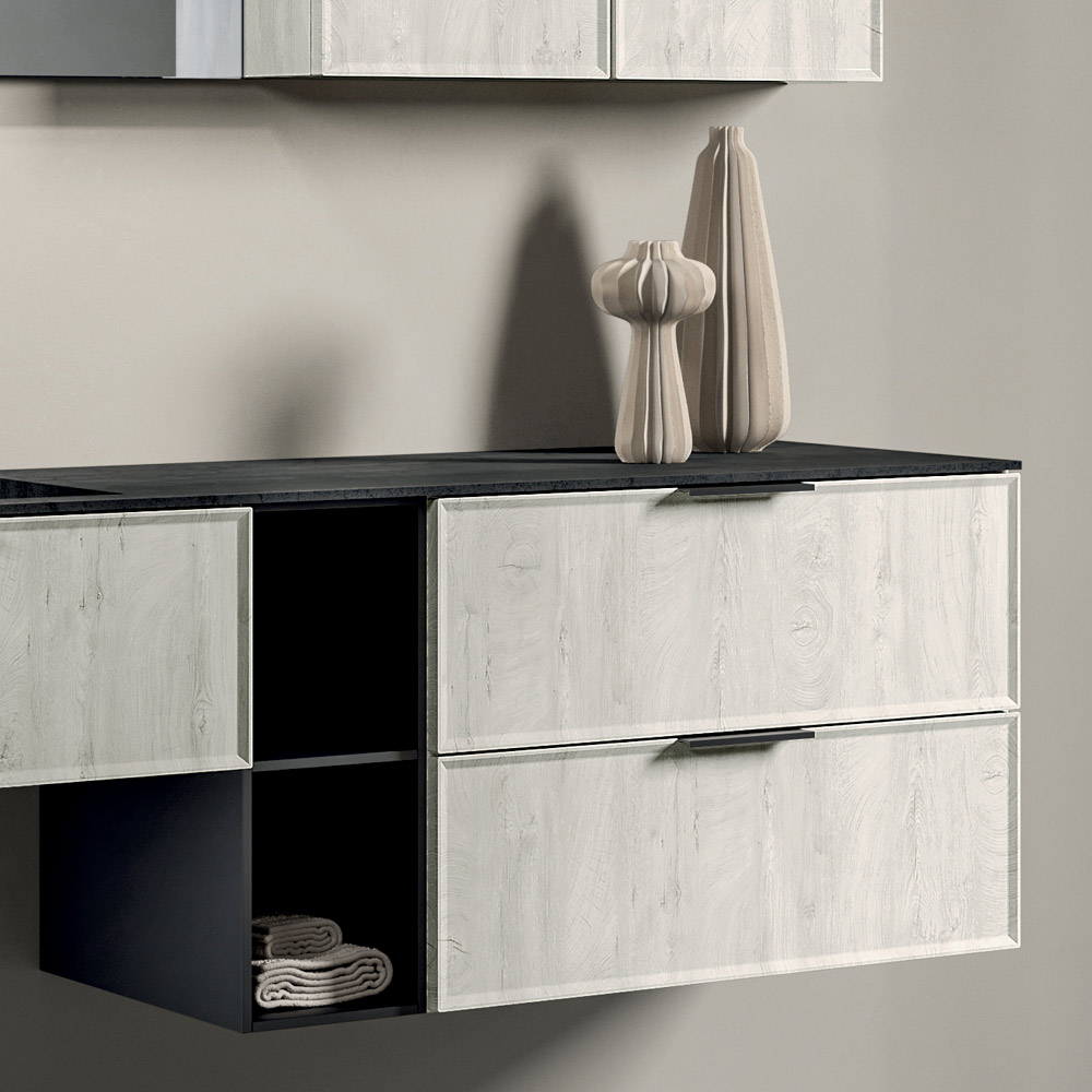 تتضمن التركيبة قاعدة كبيرة وواسعة مع أدراج (الدرج الأول مغلق)، مصممة لضمان النظام والعملية اليومية، ويحيط بها وحدتان حائطيتان تعملان على توسيع مساحة التخزين مع الحفاظ على جمالية خفيفة ومتوازنة.