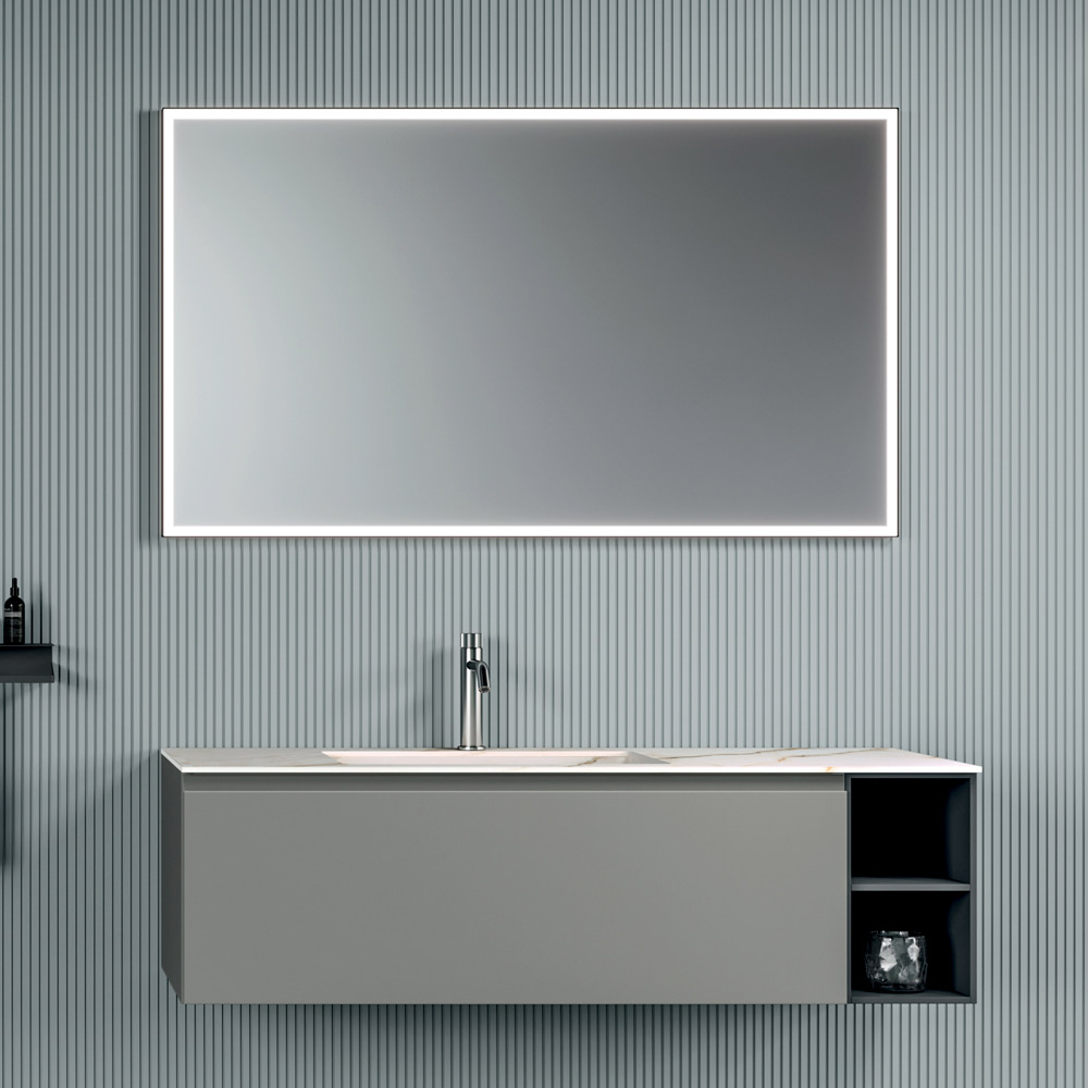 وتكتمل التركيبة بمرآة LED ذات الإضاءة الخلفية ، المصممة لتوفير إضاءة موحدة وشاملة، مثالية لتحسين مساحة الحمام وضمان إضاءة عملية وأنيقة.