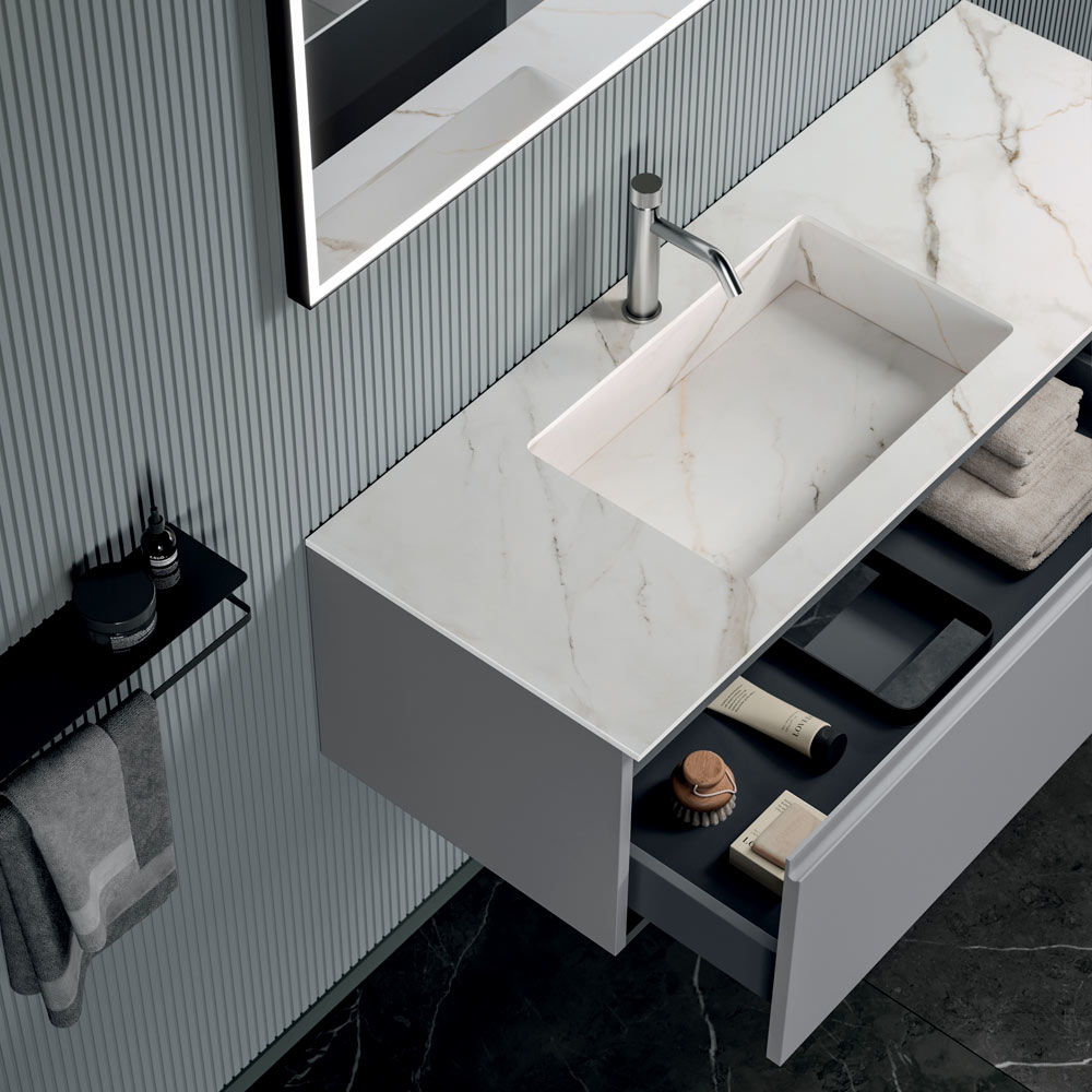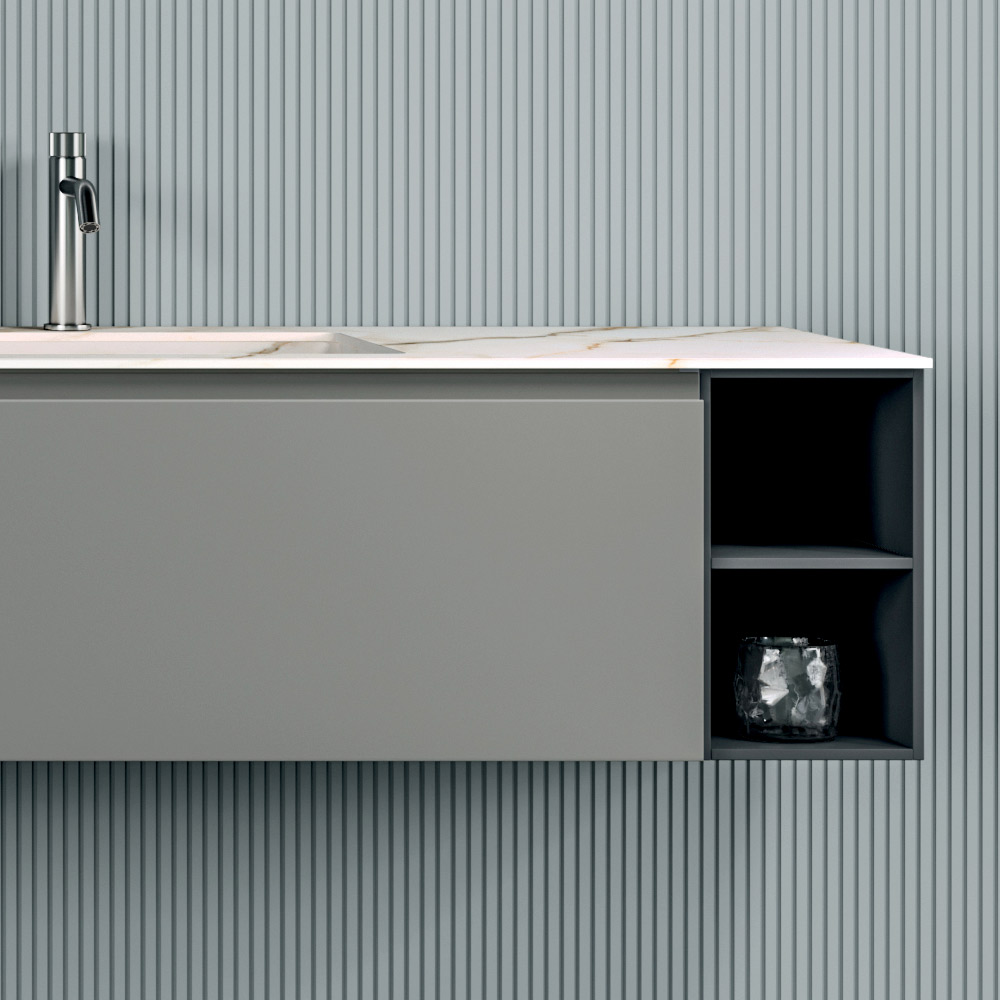 يُعبّر هذا التصميم عن أناقة عصرية بخطوطه الواضحة، وأجزائه المعلقة، ومواده الفاخرة. قطعة أثاث حمام مصممة للمساحات الراقية، حيث يلتقي التصميم بالوظائف العملية اليومية.