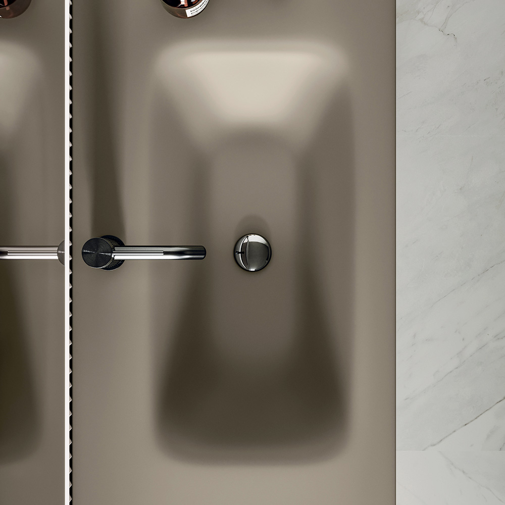 يُضفي حوض الزجاج الساتان باللون الرمادي الفاتح تناغمًا لونيًا راقيًا مع القاعدة، مما يعزز الخفة البصرية للتصميم بأكمله ويمنح منطقة الحوض إشراقًا.
