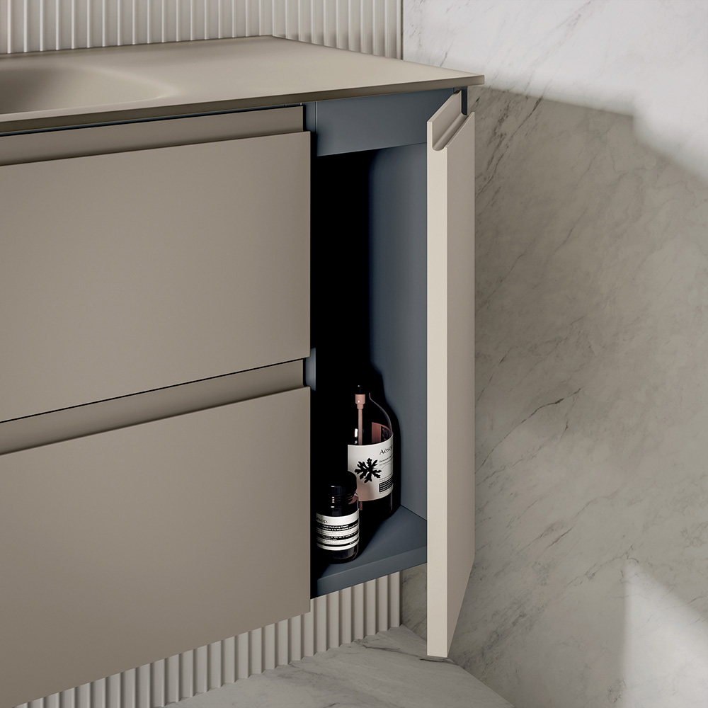 توفر الوحدة السفلية بطول 120 سم، والمزودة بدرجين وباب جانبي أيمن، والمطلية باللون الرمادي الفاتح غير اللامع، مساحة تخزين واسعة مع الحفاظ على مظهر عصري أنيق. ويضمن تصميم الباب المدمج مزيدًا من العملية والتنظيم للمساحة الداخلية.
