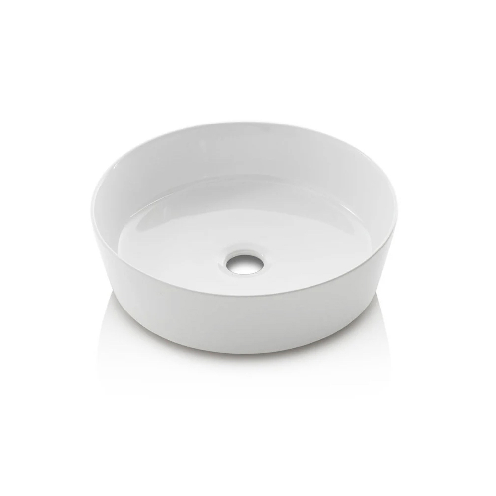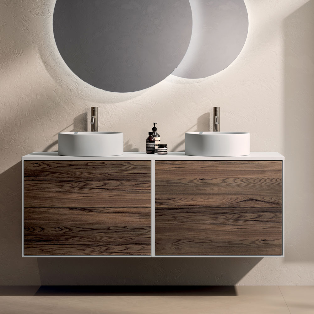 تبرز أحواض السيراميك البيضاء اللامعة المستديرة بأناقة من السطح، مما يعزز خفة التصميم العام ويُعد حلاً مثالياً للمساحات المشتركة. تتناغم أشكالها الناعمة مع الخطوط الواضحة للخزانة المعلقة على الحائط.
