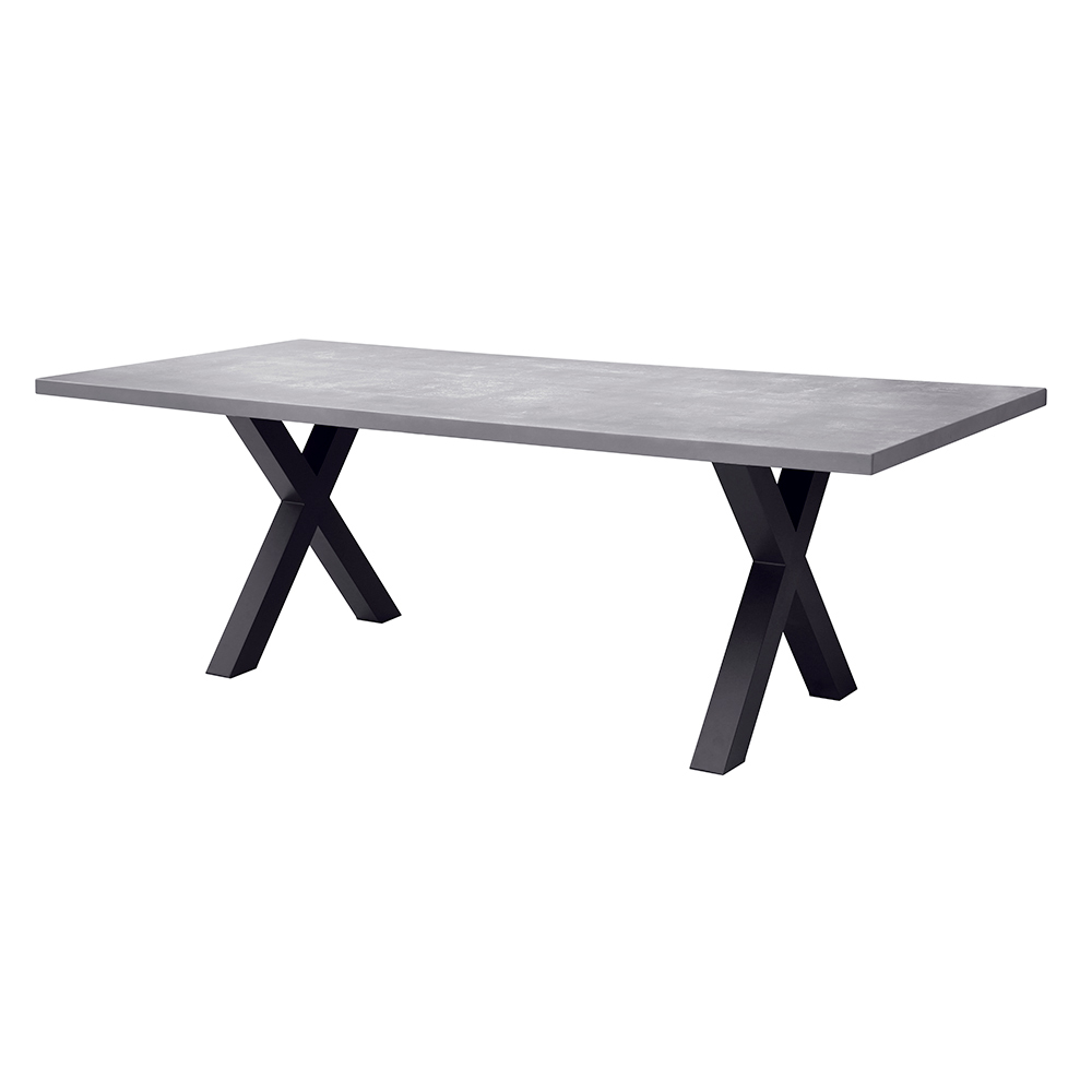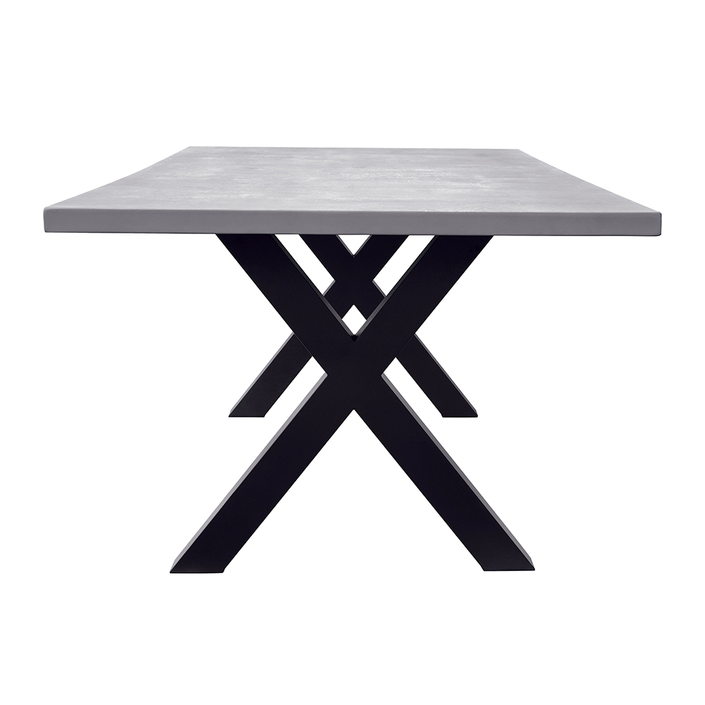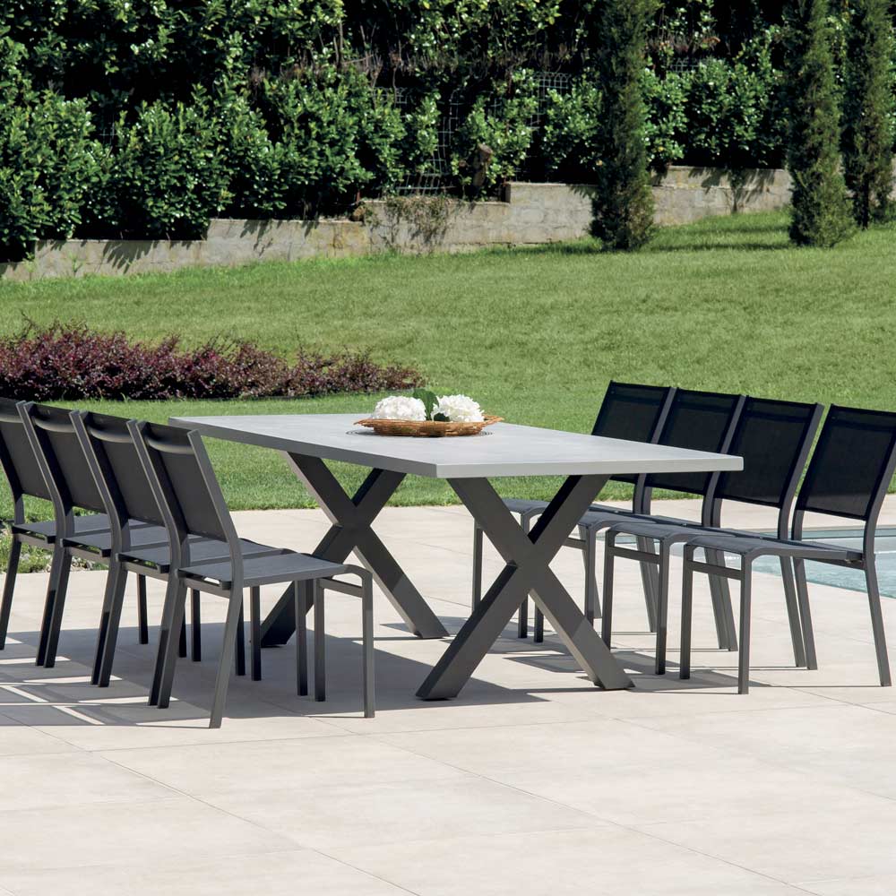 يجمع سطح الراتنج الرمادي بين الأناقة والعملية، مما يضمن سطحًا متينًا وسهل التنظيف، ومناسبًا لجميع الظروف الجوية. تضفي أرجل الألومنيوم المتقاطعة على الهيكل مظهرًا ديناميكيًا وعصريًا، مع ضمان الثبات والمتانة.
