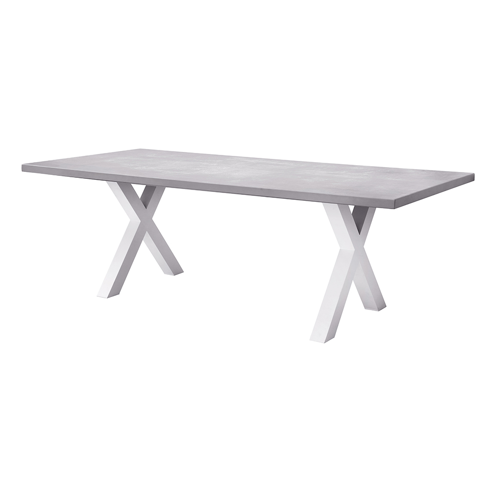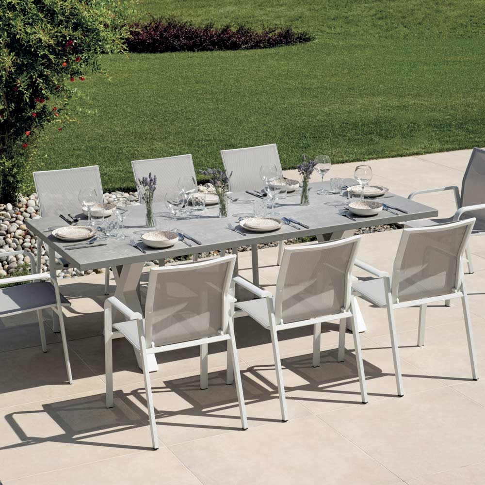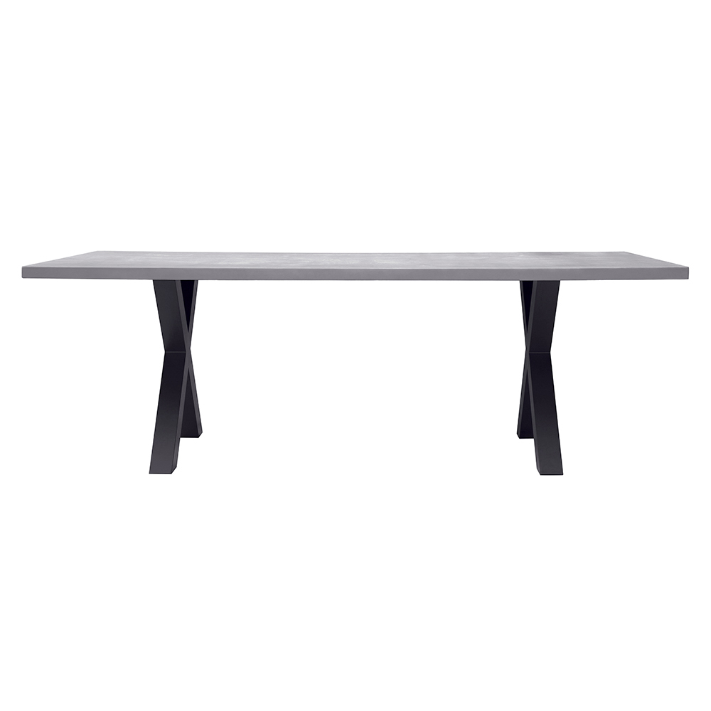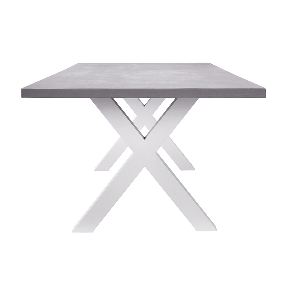 يجمع سطح الراتنج الرمادي بين الأناقة والعملية، مما يضمن سطحًا متينًا وسهل التنظيف، ومناسبًا لجميع الظروف الجوية. تضفي أرجل الألومنيوم المتقاطعة على الهيكل مظهرًا ديناميكيًا وعصريًا، مع ضمان الثبات والمتانة.