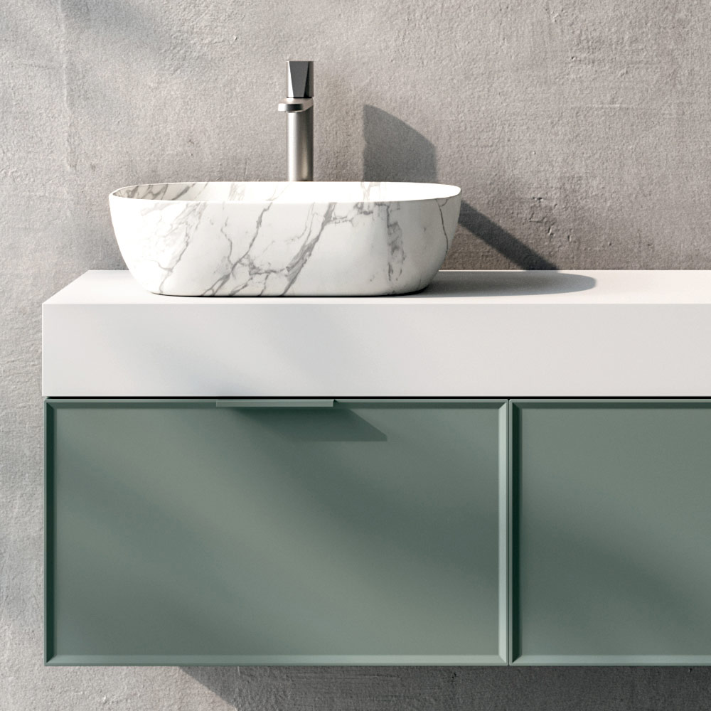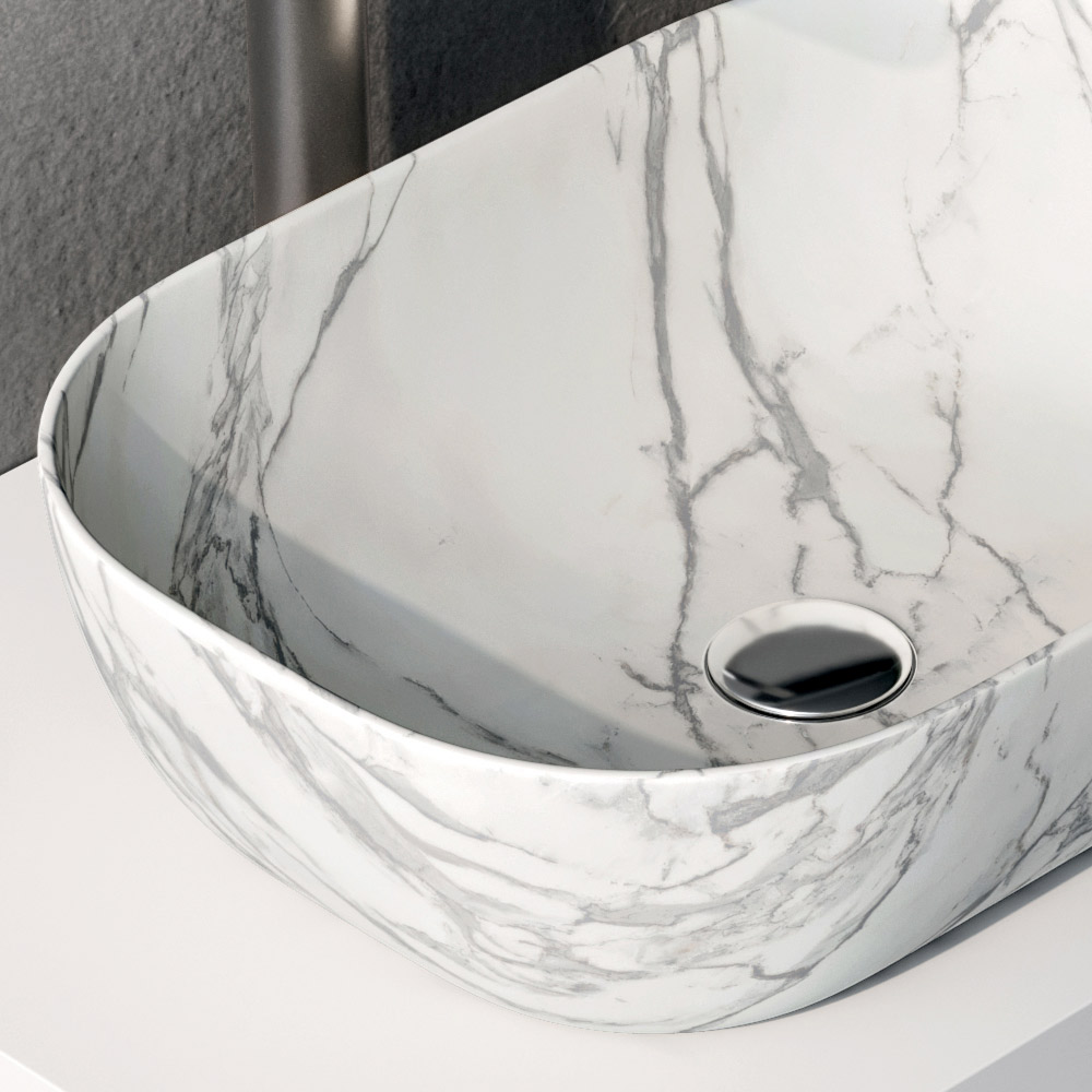 يتناغم سطح حوض الغسيل الأبيض غير اللامع بشكل متناغم مع حوض الغسيل الخزفي ذي تأثير كالاكاتا ، والذي يتميز بسطح لامع وعروق دقيقة تذكرنا بالرخام، مما يعزز التكوين بأكمله.