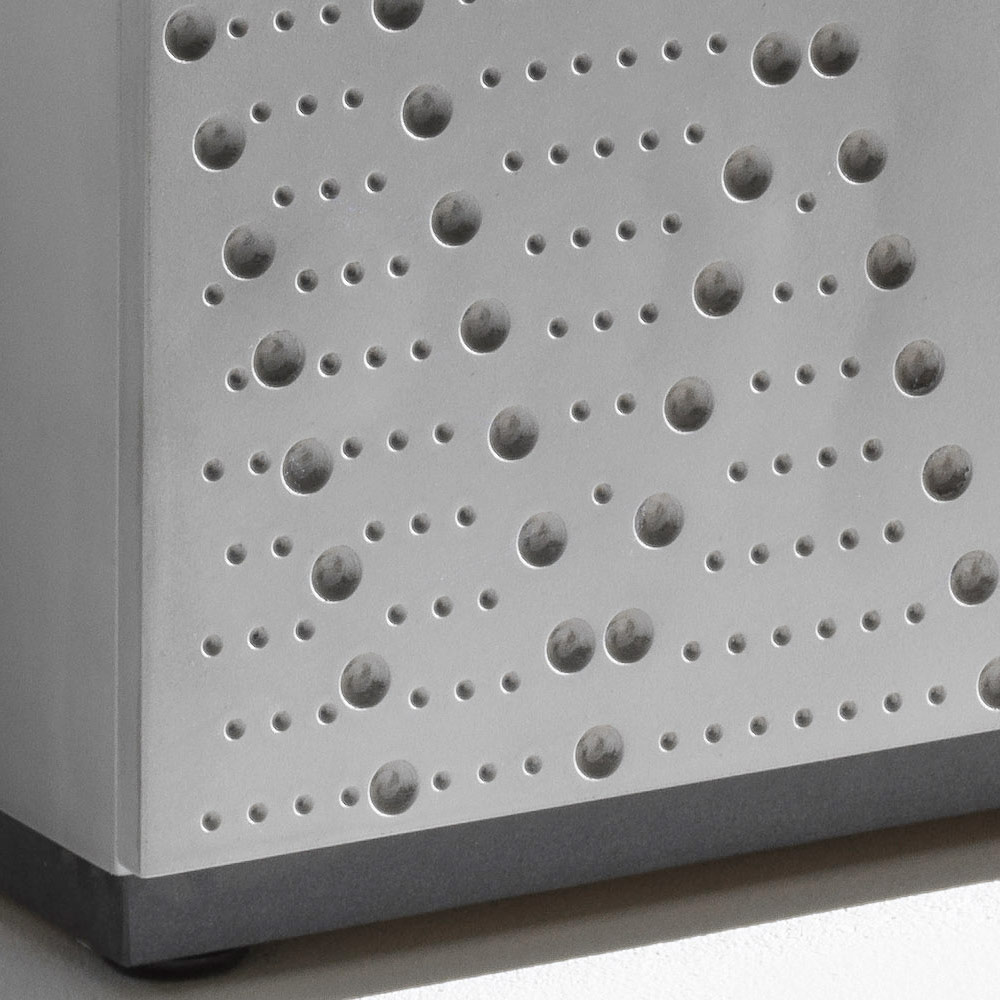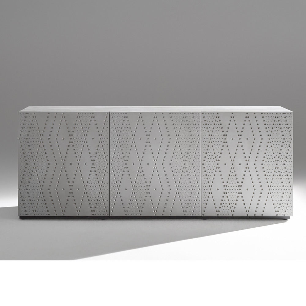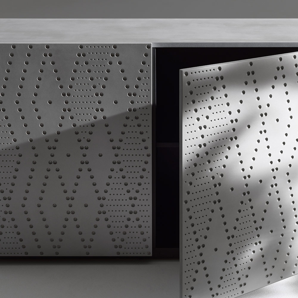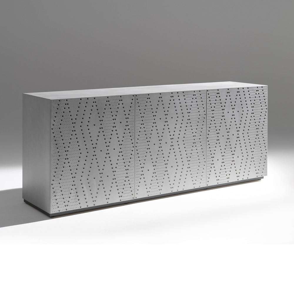 إن زخرفة الألمنيوم المستخدمة في المسبك ، والمستوحاة من العمليات الصناعية والتي أعيد تفسيرها بأسلوب زخرفي، تجعل كل خزانة جانبية فريدة من نوعها ومثالية أيضاً للبيئات التعاقدية أو المساحات التمثيلية.