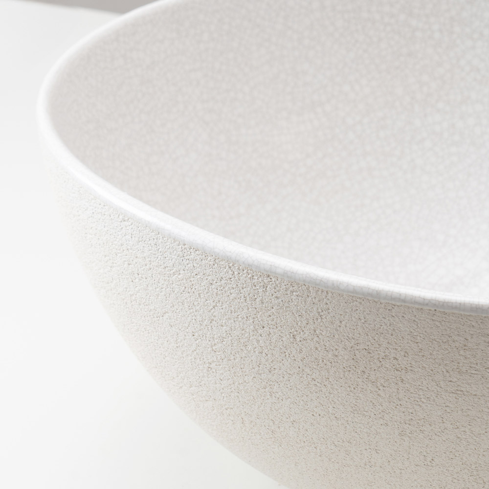 تمنح تقنية راكو الحوض سطحًا ذا ملمس مميز وطبيعي، يتجلى ذلك في التباين بين السطح الداخلي المطلي والسطح الخارجي الطبيعي. وتضفي التشققات الدقيقة والعيوب الطفيفة في الطلاء على كل قطعة طابعًا فريدًا، ما يعكس براعة فائقة في الصنع.