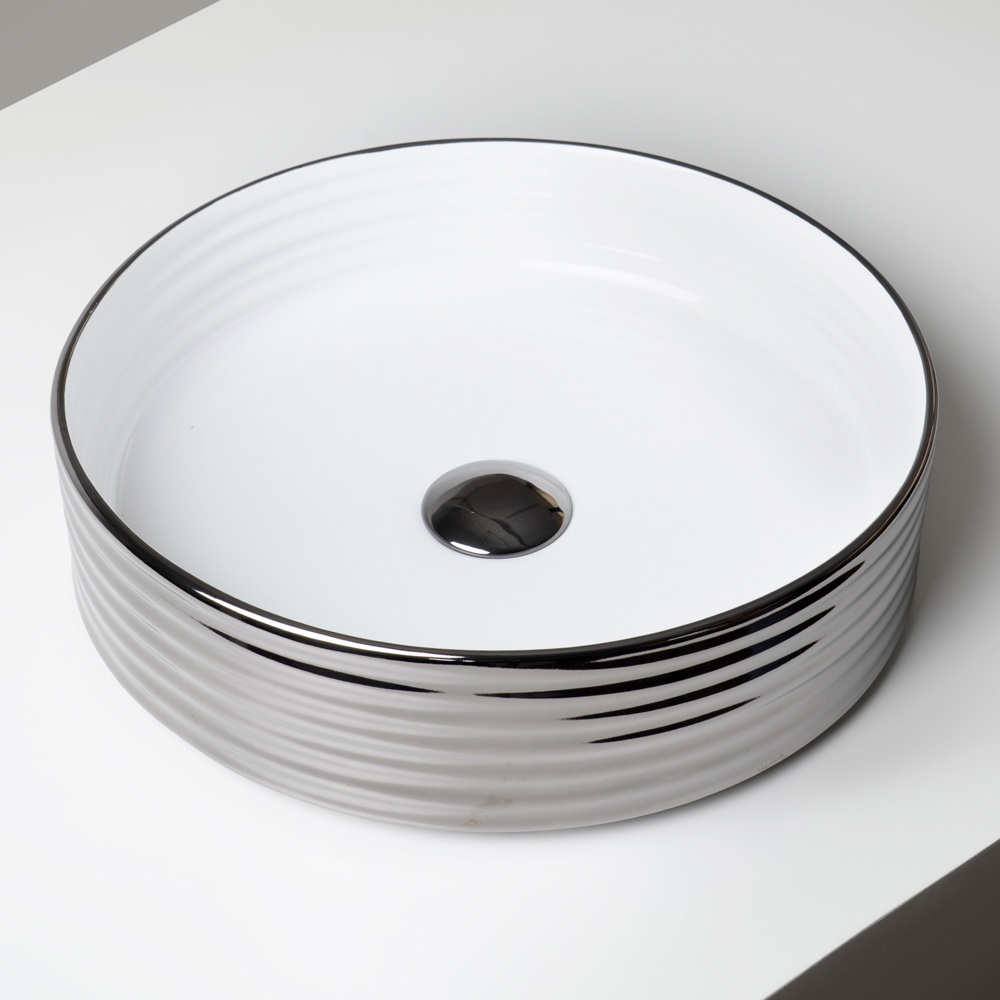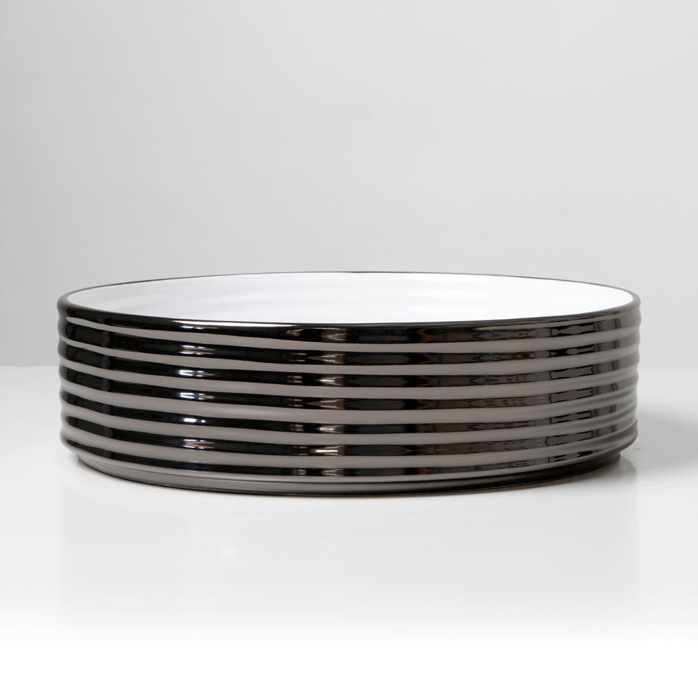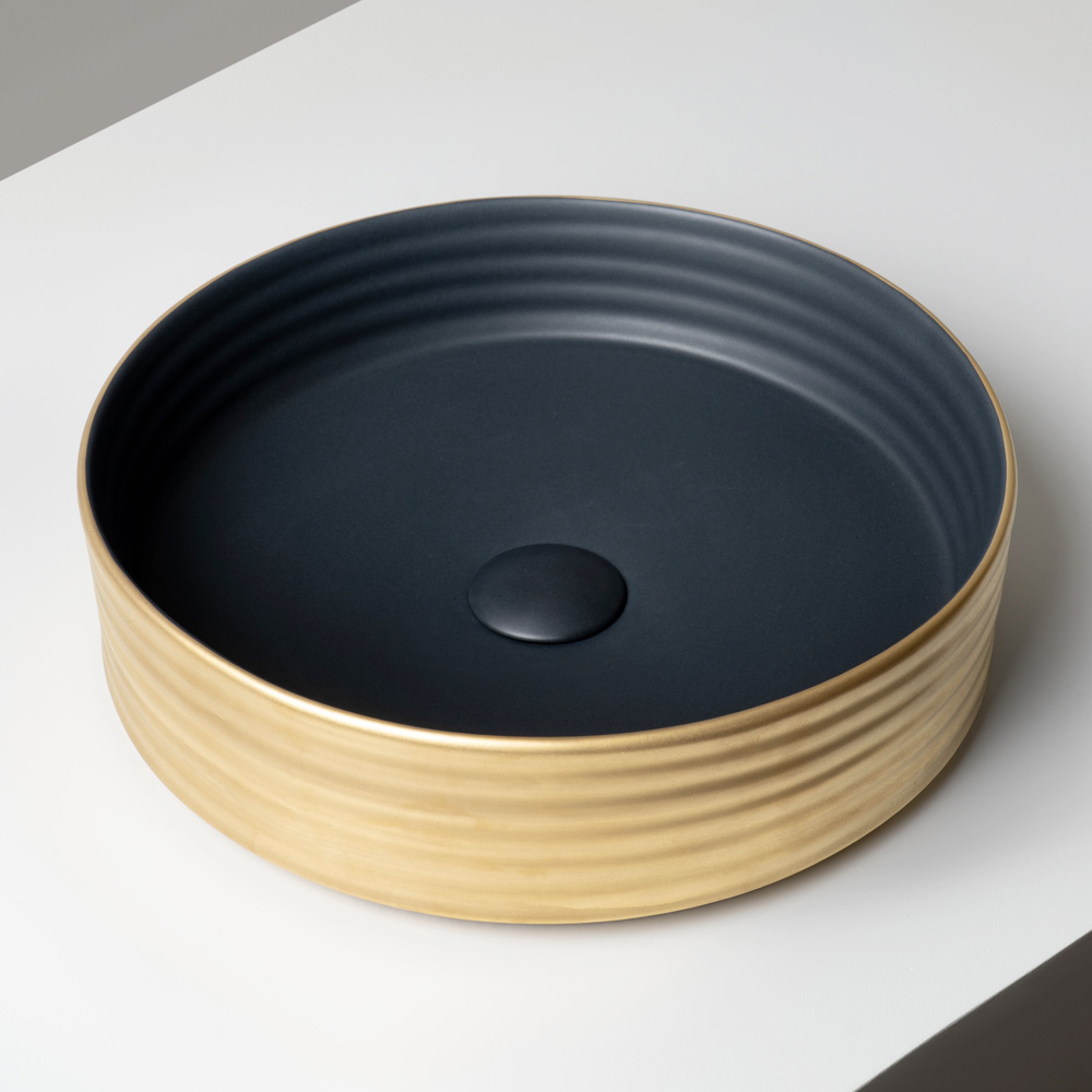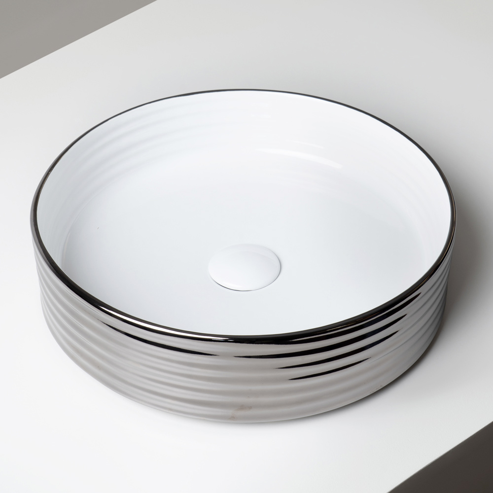 يُضفي التباين بين السطح الداخلي المطلي بالمينا والتشطيبات الخارجية على الحوض لمسةً راقيةً وعصرية، مما يجعله قطعةً مميزةً في الحمام. كما تُعزز لوحة الألوان الأنيقة والراقية حجمه بانعكاساتٍ متلألئة وعمقٍ ملمسي.