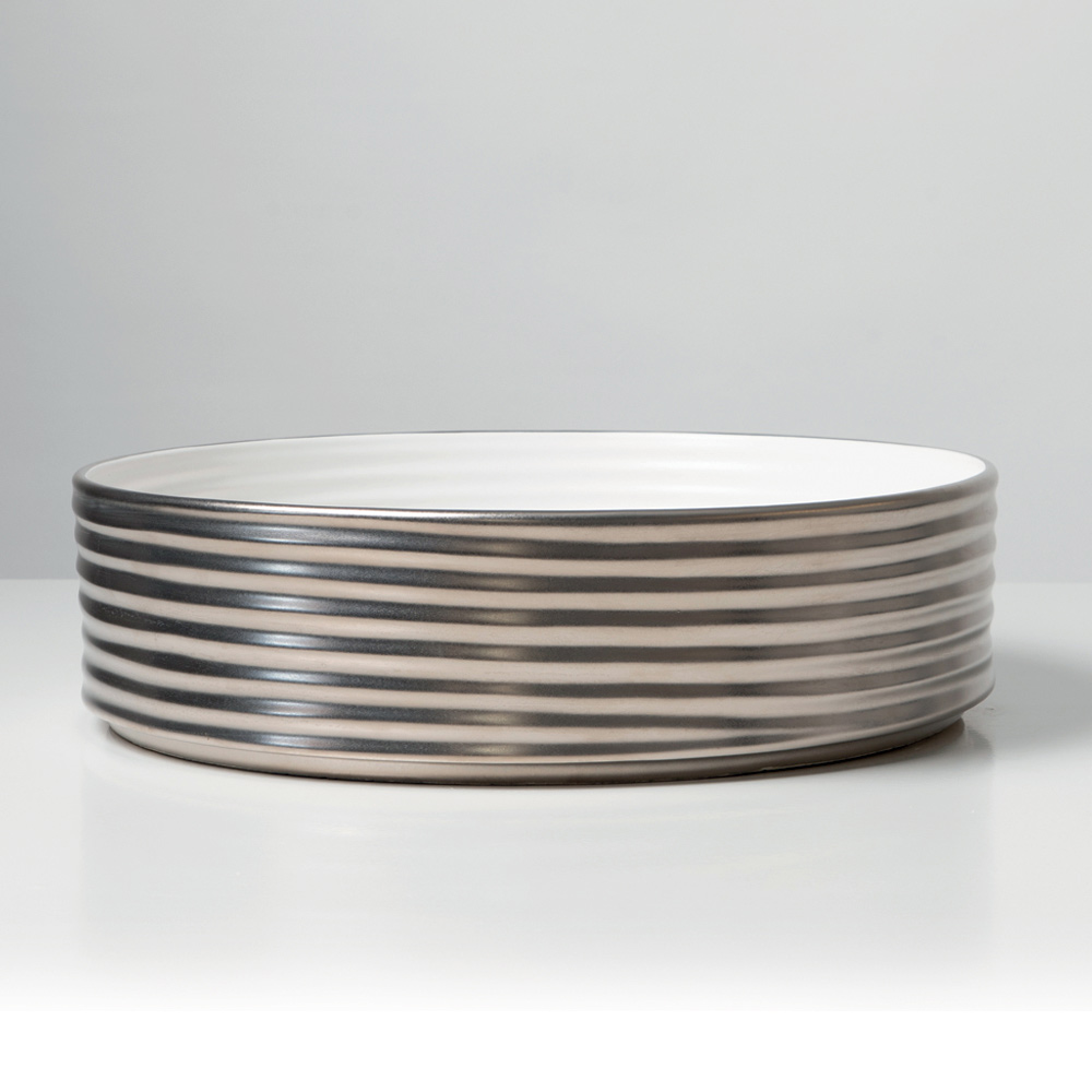 حوض المطبخ هذا المصنوع من الخزف الحجري، والمُشكّل يدويًا ، يتميز بسطحه المتموج ذي الخطوط الأفقية ، الذي يعكس الضوء ويحوّل المادة إلى عنصر انسيابي ناعم وراقي. قطعة تصميم تجمع بين البحث الجمالي والبراعة الحرفية.
