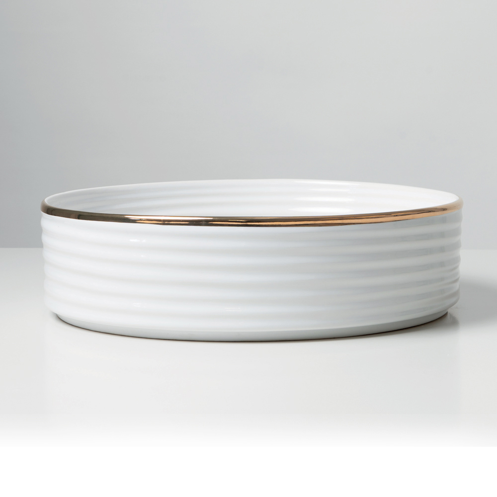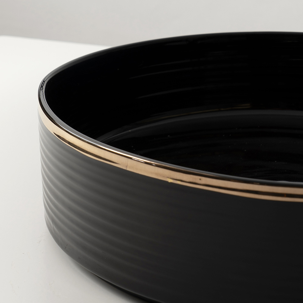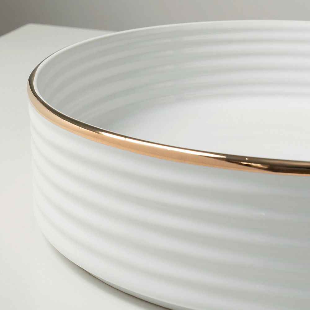 بفضل توازنها بين الشكل الأساسي والتفاصيل الزخرفية، تتناسب هذه المغسلة تمامًا مع الحمامات الحديثة أو المعاصرة أو المستوحاة من الفخامة، لتصبح نقطة محورية راقية لسطح المغسلة.
