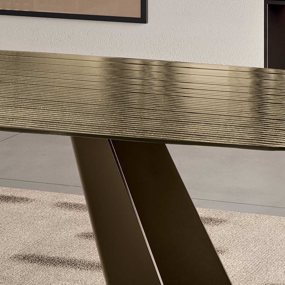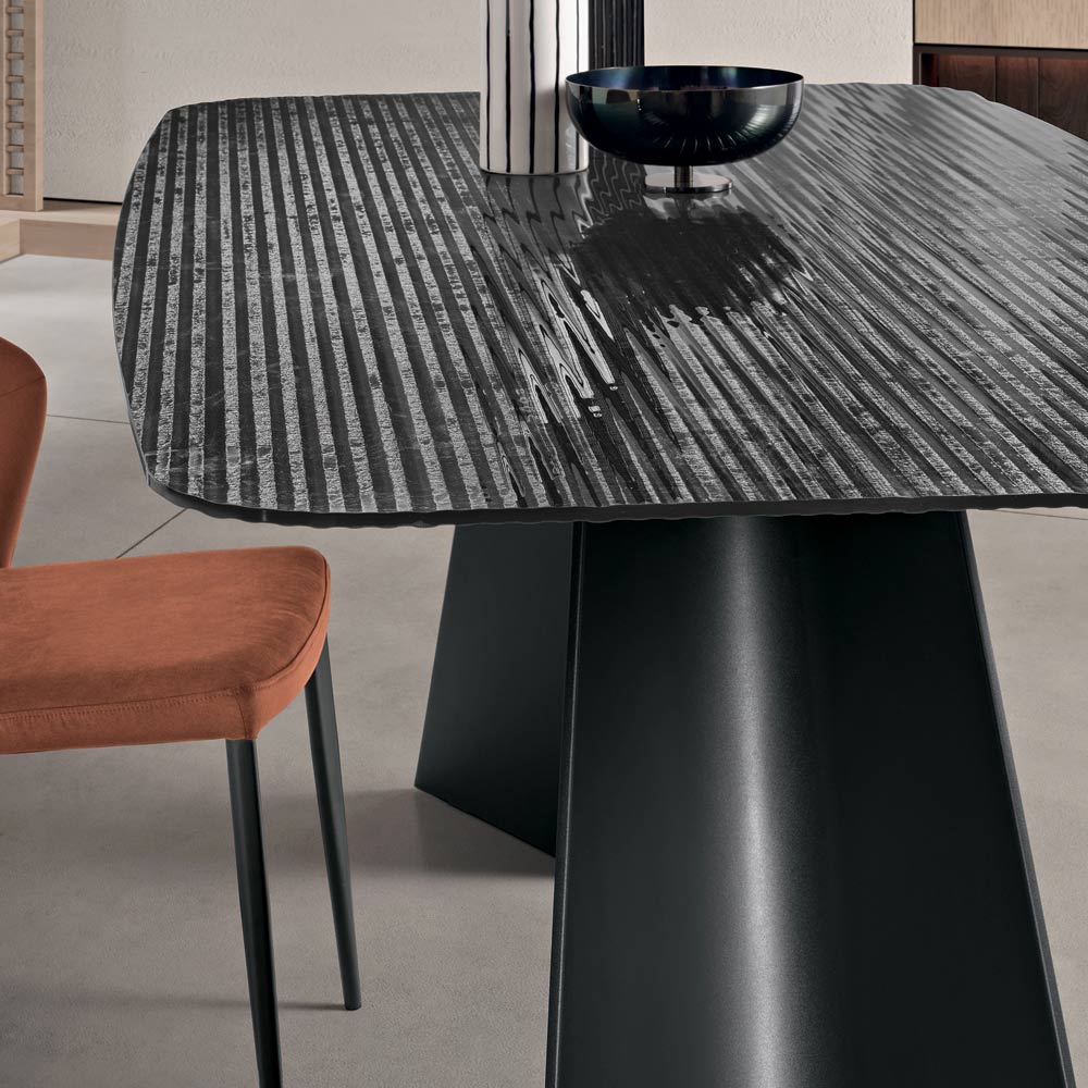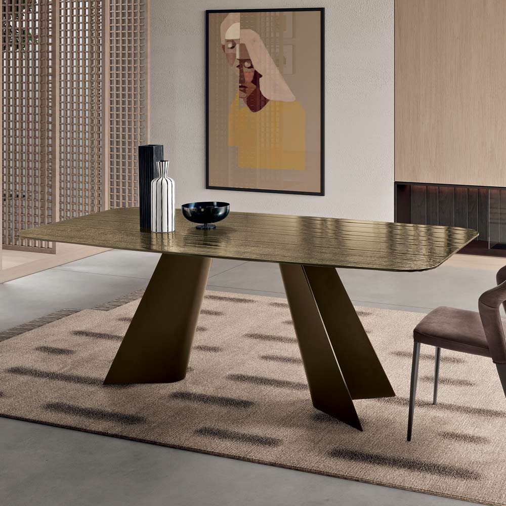 تتألف القاعدة المعدنية المطلية المميزة من عنصرين رفيعين على شكل حرف V ناعمين يتناقصان تدريجيًا نحو الأعلى، مما يخلق بنية أنيقة وديناميكية. يمنح هذا التصميم الطاولة خفة بصرية مع ضمان استقرارها ومتانتها.