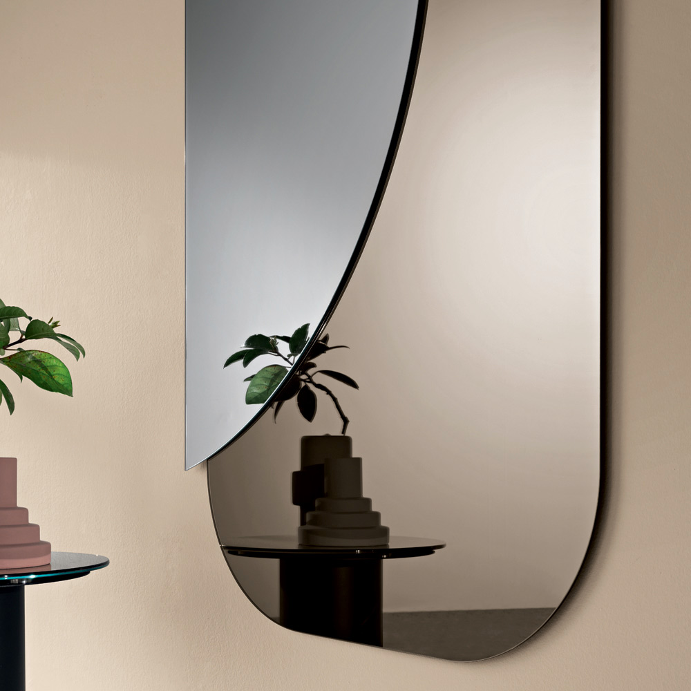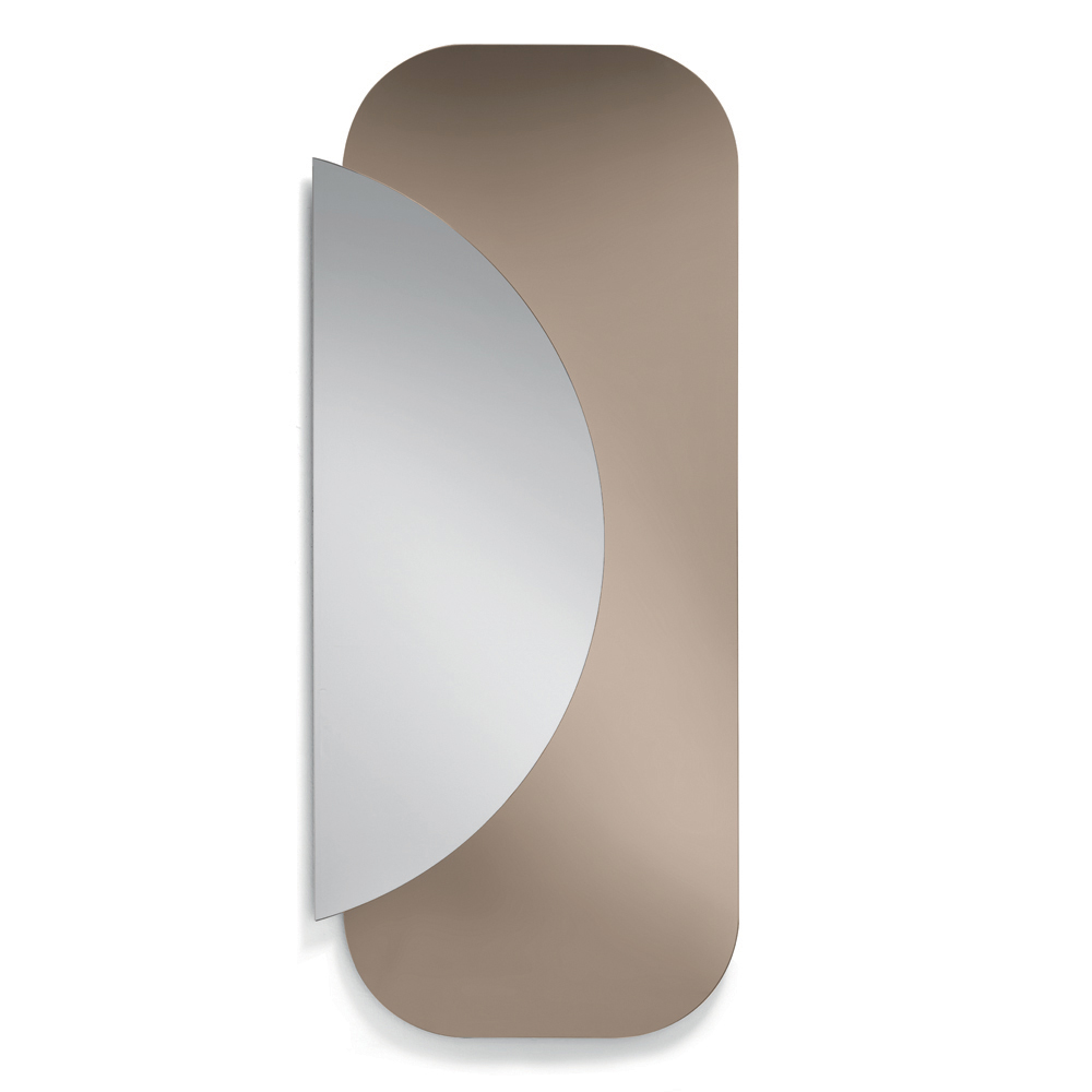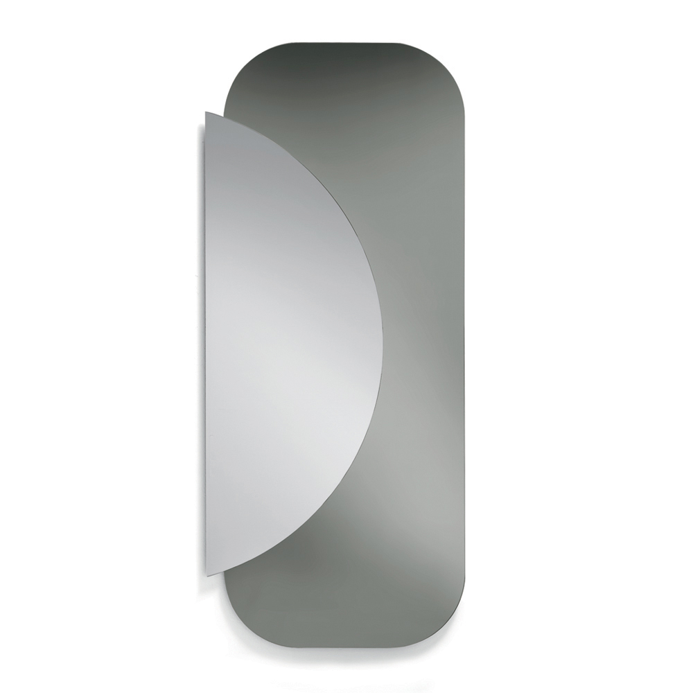 يتألف التصميم من لوحين متداخلين : قاعدة مستطيلة ذات زوايا ناعمة ونصف دائرة من المرآة الطبيعية تتداخل معها، مما يخلق حوارًا أنيقًا بين الهندسة والانعكاسات. هذا التباين بين الأشكال والمواد يخلق تأثيرًا بصريًا ديناميكيًا وعصريًا.