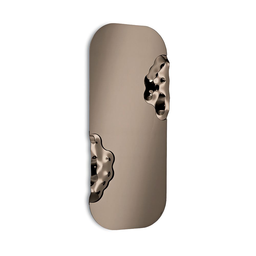 يُضفي السطح المستطيل ذو الزوايا الدائرية توازناً وخفة بصرية على التصميم. تم إدخال عنصرين زجاجيين متناسقين اللون على جانبي المرآة، موضوعين بشكل متناظر على الجوانب الرأسية، مما يُضيف ملمساً وعمقاً للتصميم، ويخلق تبايناً أنيقاً بين الأسطح الملساء والزخارف المتقنة.