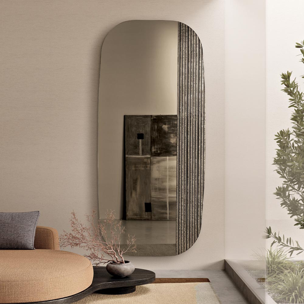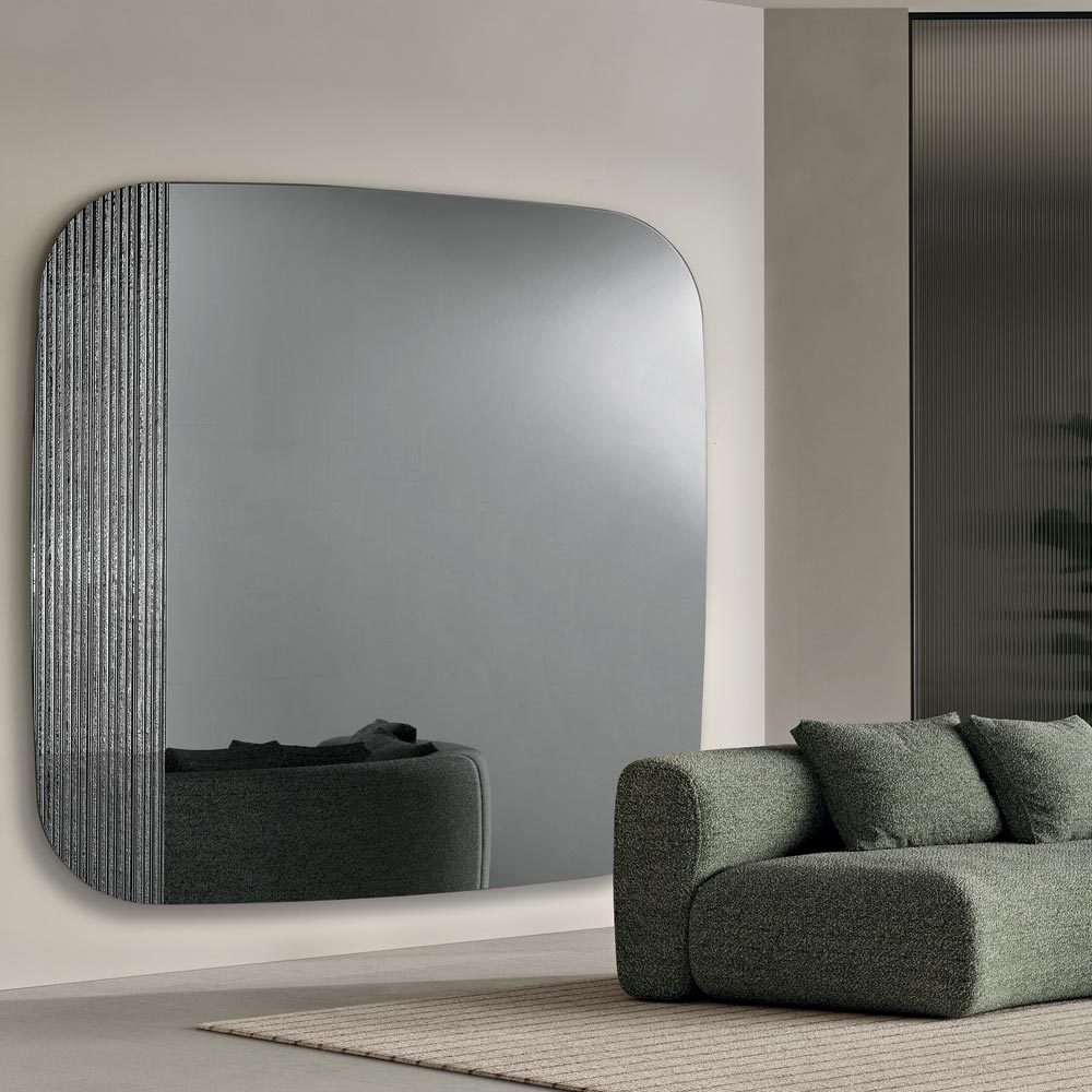 يتميز السطح العاكس بتصميم انسيابي ذي زوايا مستديرة ناعمة ، مصمم لخلق تأثير بصري رقيق ومتناغم. ويزدان التصميم بإطار زجاجي مضلع مطلي بالفضة بلون متناسق يضفي عمقًا وحيوية، مما يخلق تفاعلًا راقيًا بين الضوء والملمس على سطح المرآة.