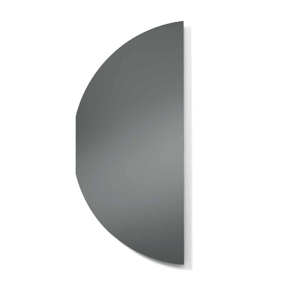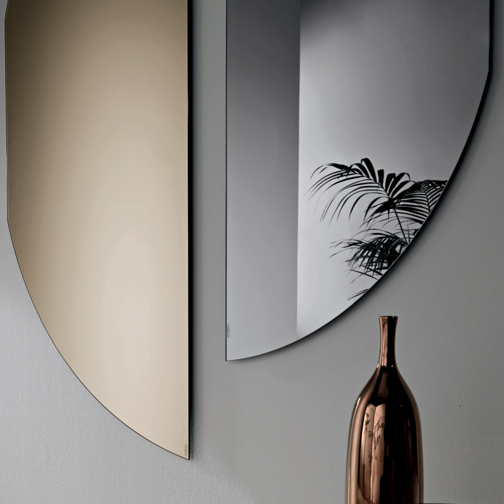 تتميز المرآة بشكلها المنحني الذي يُشبه نصف دائرة بانحناءة متقطعة ، مما يخلق صورة ظلية أصلية ومتناغمة. يمنح هذا الشكل الهندسي البسيط المرآة حضورًا بصريًا قويًا مع الحفاظ على جمالية بسيطة وراقية.