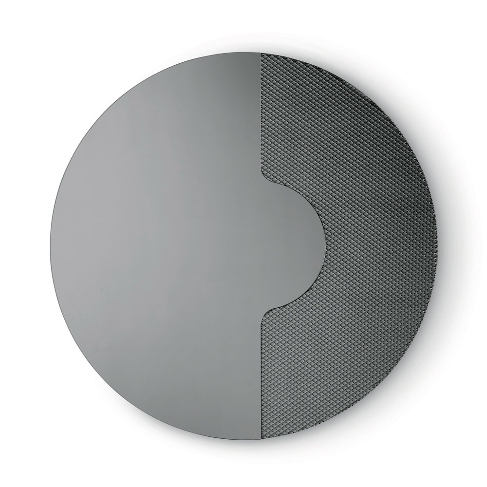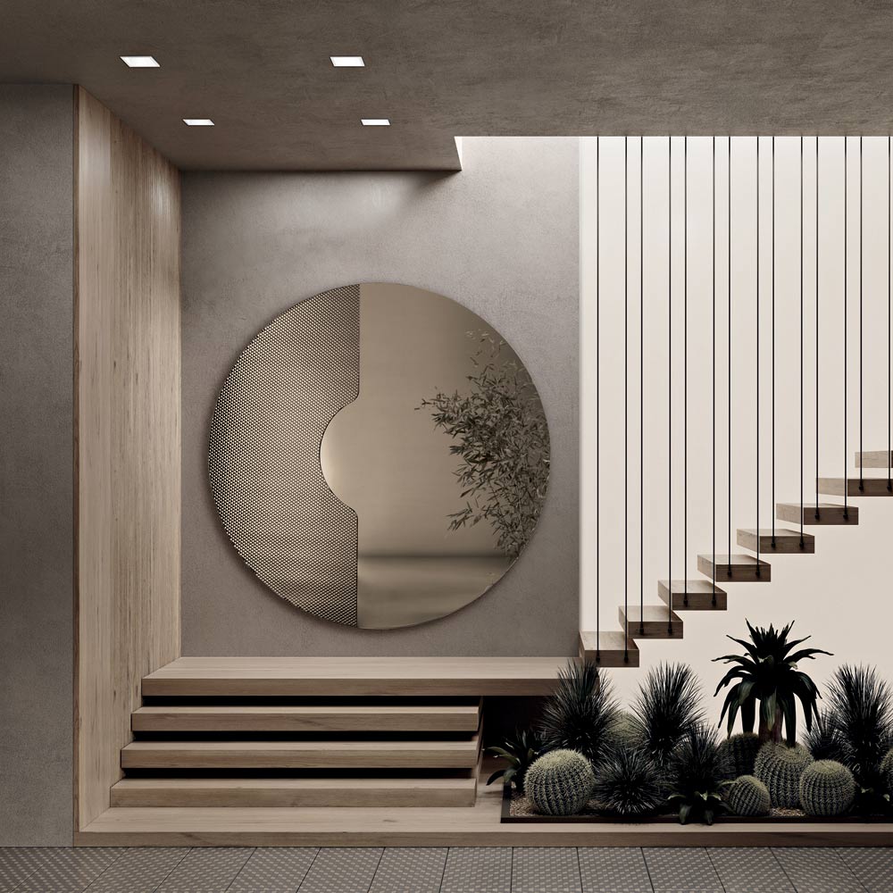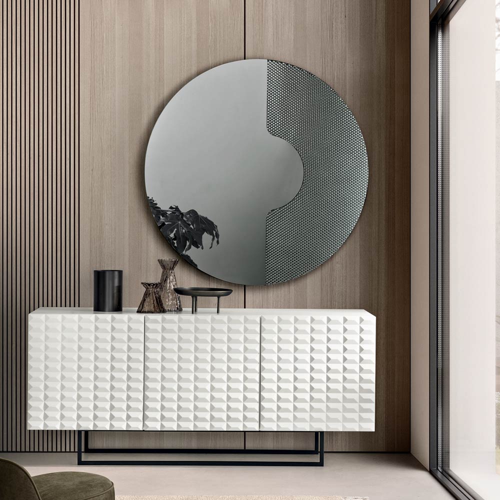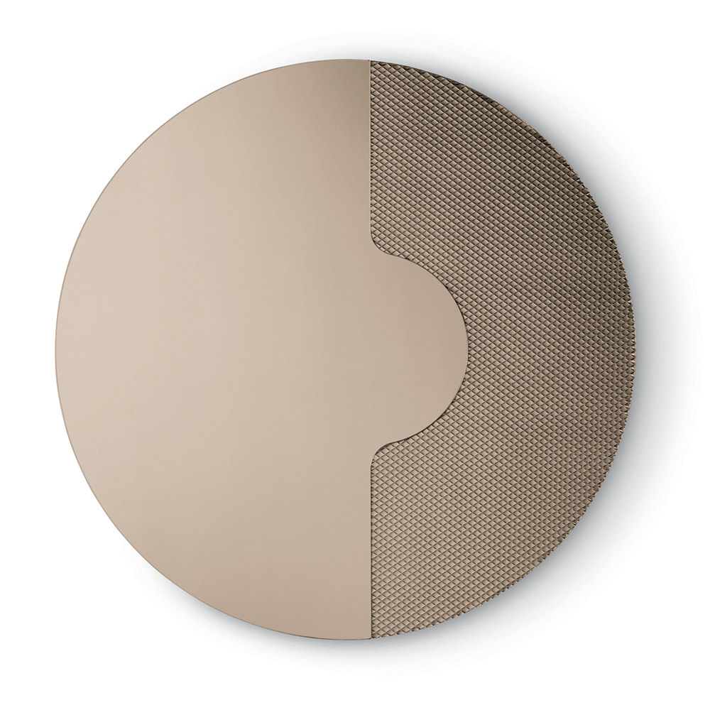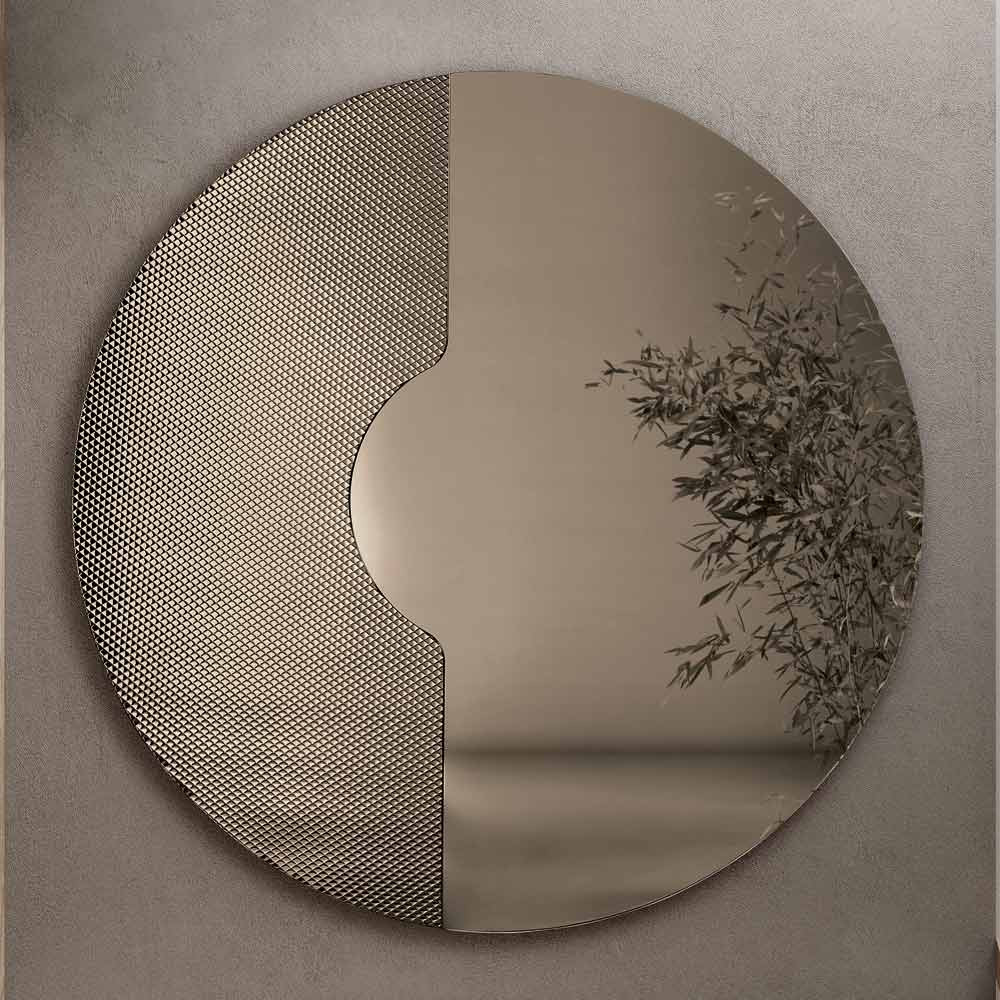 تتميز المرآة الدائرية بإطار جانبي من الزجاج بلون متناسق محفور عليه نقش شبكي . يحمل هذا العنصر الزخرفي لوحة المرآة كما لو كانت تستقر عليه، مما يخلق تأثيرًا ثلاثي الأبعاد راقيًا وتفاعلًا أنيقًا بين السماكات والانعكاسات.
