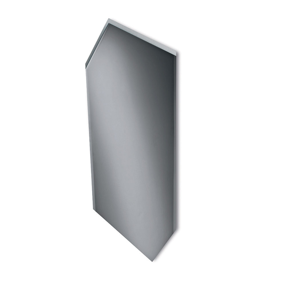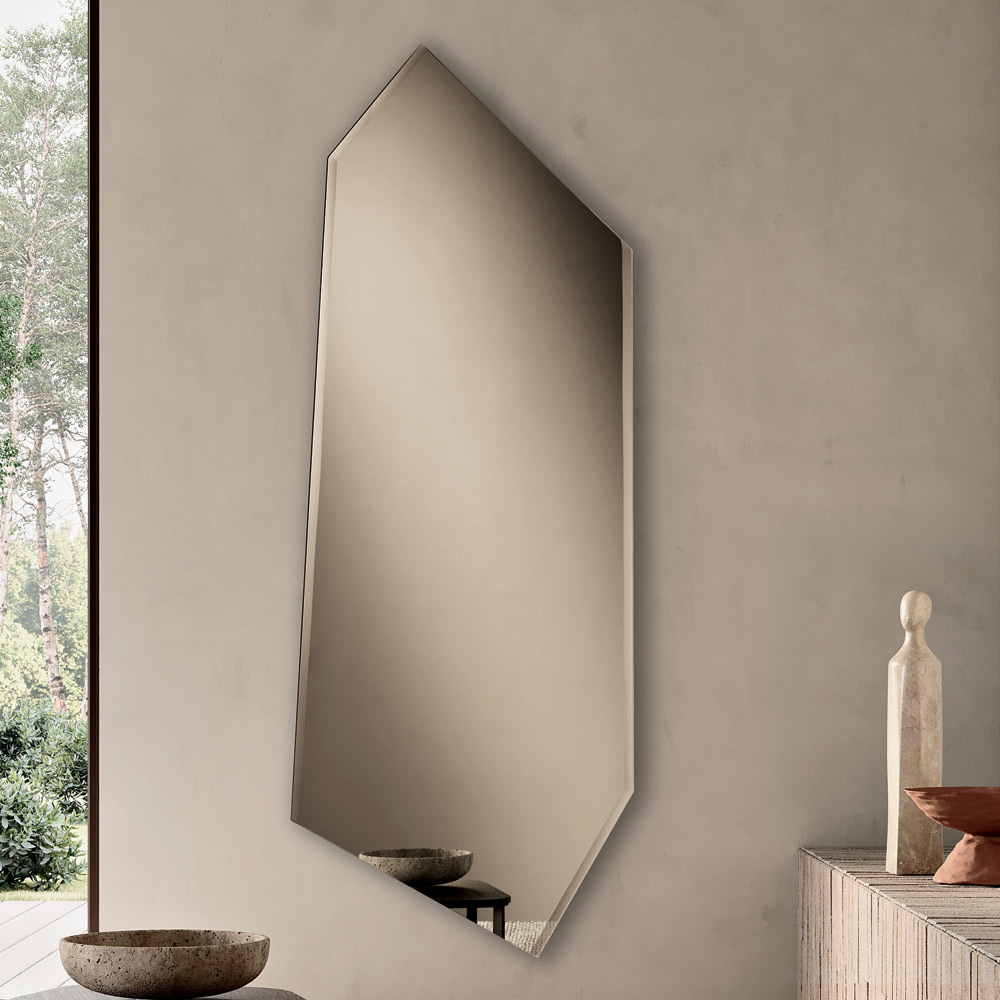 تتميز المرآة بشكل غير منتظم يُشبه المستطيل المفتوح من ستة جوانب، مما يُضفي عليها مظهراً عصرياً غير تقليدي. ويُزيّن جانبها بشطف جزئي من أربعة جوانب ، وهو تفصيل دقيق ولكنه ثمين يُبرز الخطوط ويُضفي بريقاً على سطحها العاكس.