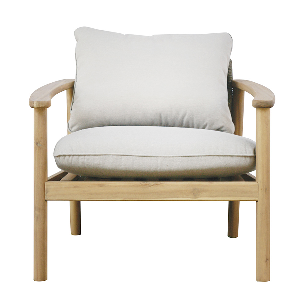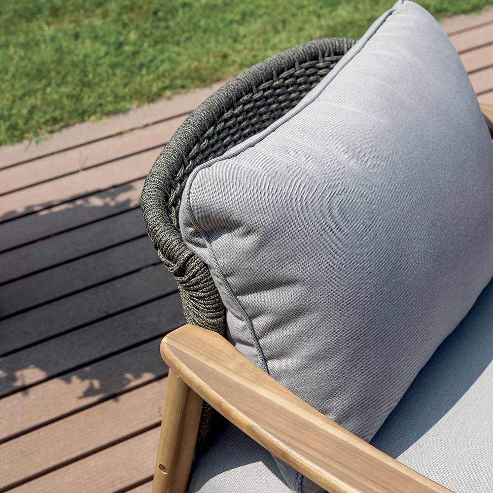 إطار خشب الأكاسيا يضفي صلابةً ودفءً، بينما تُضفي تفاصيل الحبل المنسوج بلون الأنثراسيت لمسةً عصريةً وراقية. تضمن الوسائد الرمادية القابلة للإزالة راحةً فائقةً وسهولةً في الصيانة، مما يُحافظ على المظهر الراقي والمُرحّب لغرفة المعيشة مع مرور الوقت.