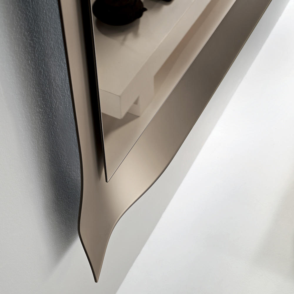 يُحيط بالسطح العاكس إطار زجاجي مصنفر ذو زوايا منحنية قليلاً . تعمل هذه العملية على التقاط الضوء وانكساره بدقة، مما يخلق تلاعبًا أنيقًا بالانعكاسات يُضفي حيوية على السطح ويمنح المرآة عمقًا.