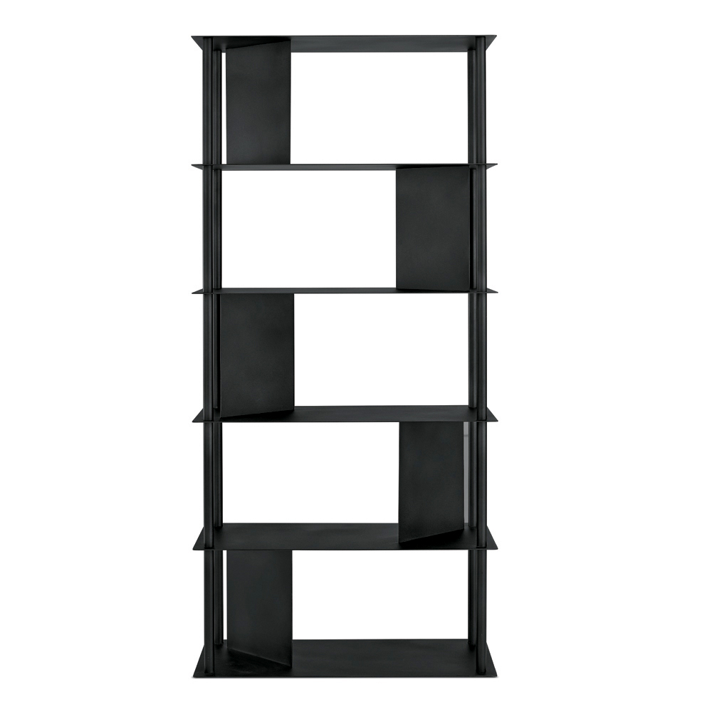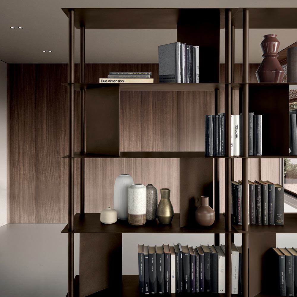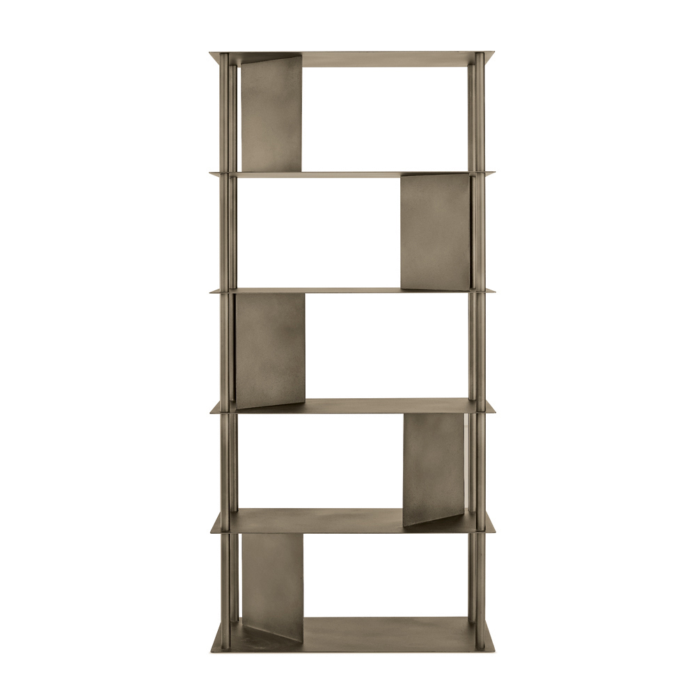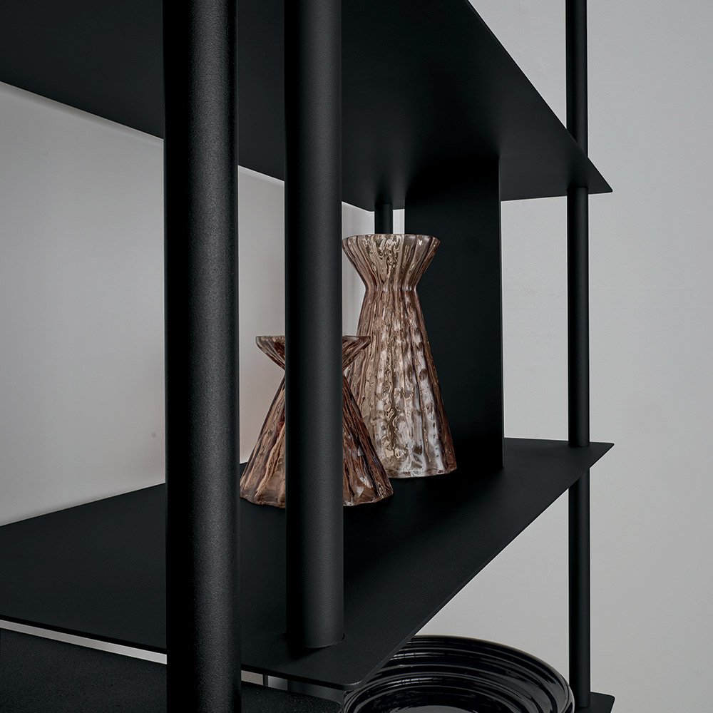 صُنعت خزانة الكتب من المعدن المطلي ، وتتألف من أربعة أنابيب محيطية عمودية تدعم الرفوف، تتخللها ألواح مائلة تحدد المساحة وتُستخدم كدعامات للكتب والأشياء. يخلق هذا التصميم تفاعلاً راقياً بين الأجزاء الصلبة والفراغات، مما يضفي ديناميكية وعمقاً على التكوين.