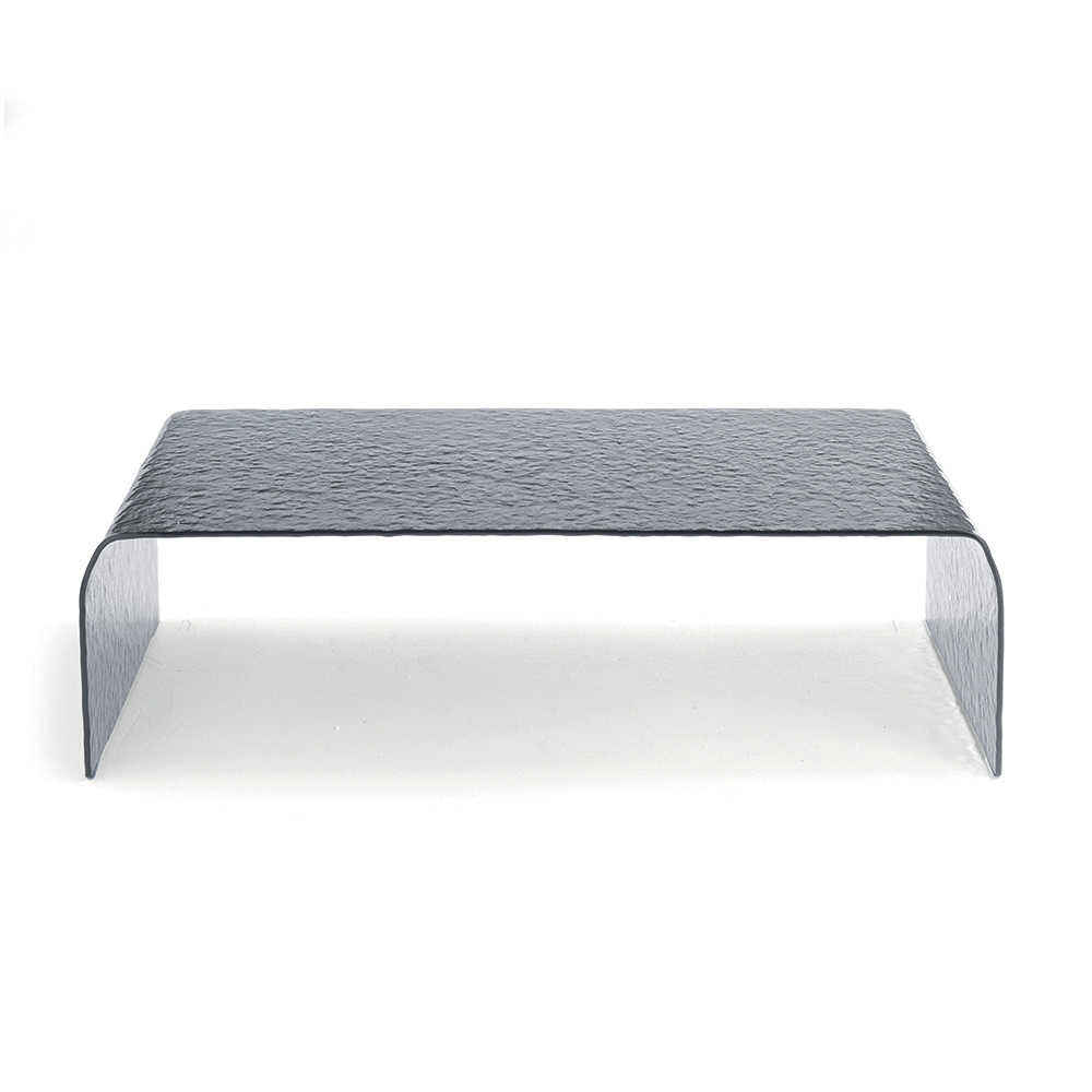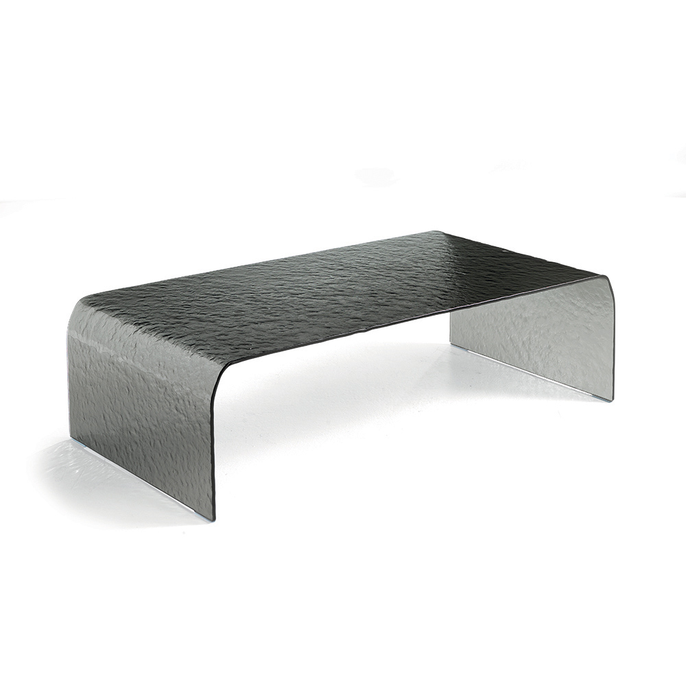 صُنعت طاولة القهوة هذه من لوح زجاجي شفاف منحني واحد ، وتتميز بلمسة نهائية مطروقة أنيقة تخلق تلاعبًا رقيقًا بين الانعكاسات والعمق. يعزز شكلها المتصل والمتجانس نقاء المادة، محولًا الطاولة إلى قطعة فنية منحوتة بحق.