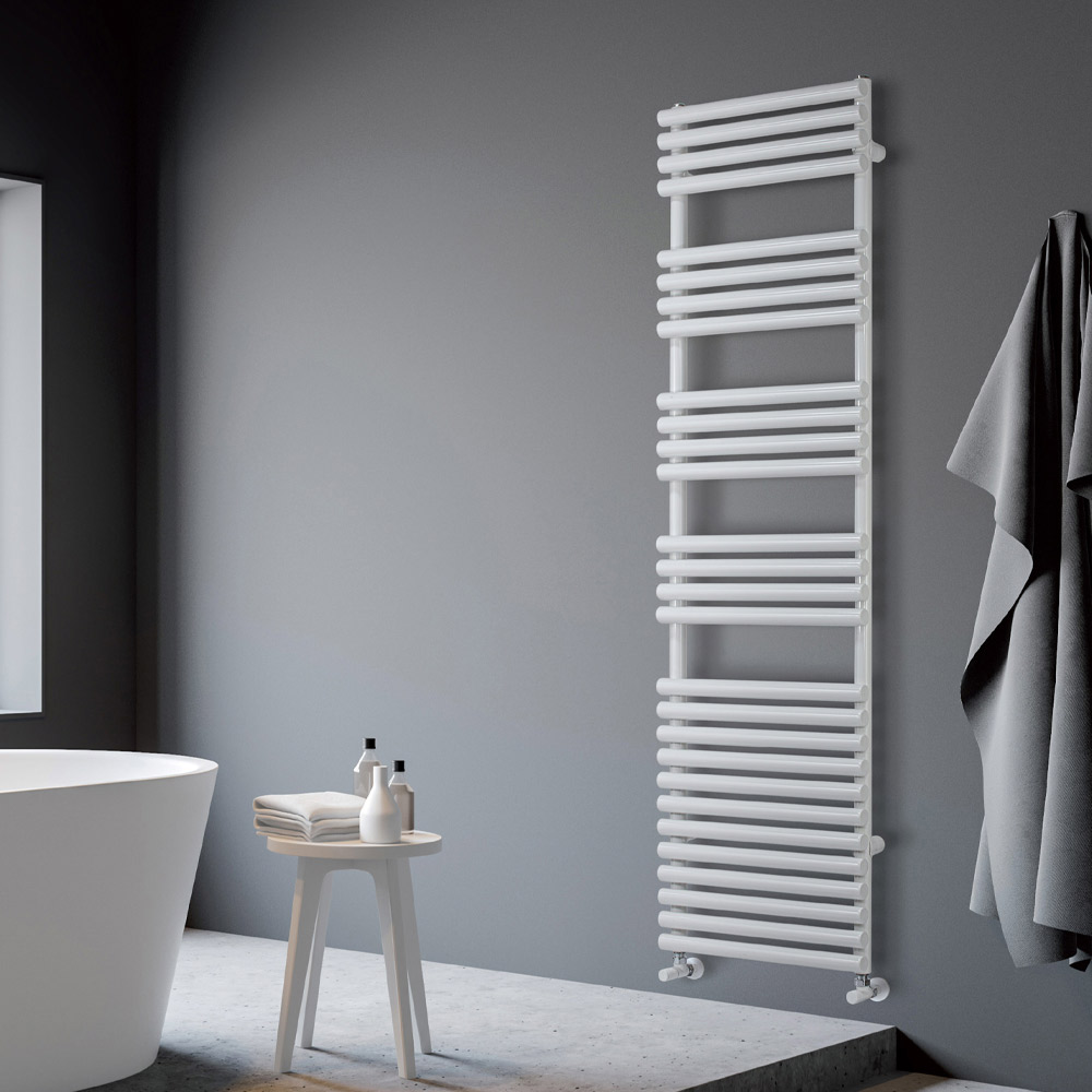 سخان مناشف هيدروليكي مصنوع من الفولاذ الكربوني بطلاء أبيض لامع نقي، يتكون من سلسلة من العناصر الأفقية بقطر 3.5 سم ملحومة على مشعبات رأسية بقطر 3.5 سم، مصنوع بالكامل في إيطاليا مع مجموعة تثبيت على الحائط وصمام تهوية وغطاء مانع للتسرب . يُصنع هذا العنصر في مصنع تريفيزو، على بُعد كيلومترات قليلة من البندقية، ما يضمن أعلى معايير الجودة والكفاءة التي تميز المنتجات الإيطالية. وتُشكل المعرفة والسعي الدؤوب نحو الابتكار في العمليات والمنتجات أساس وقيم ابتكار منتج يجمع بين أحدث التقنيات والتصميمات ، والجمال والوظائف العملية.