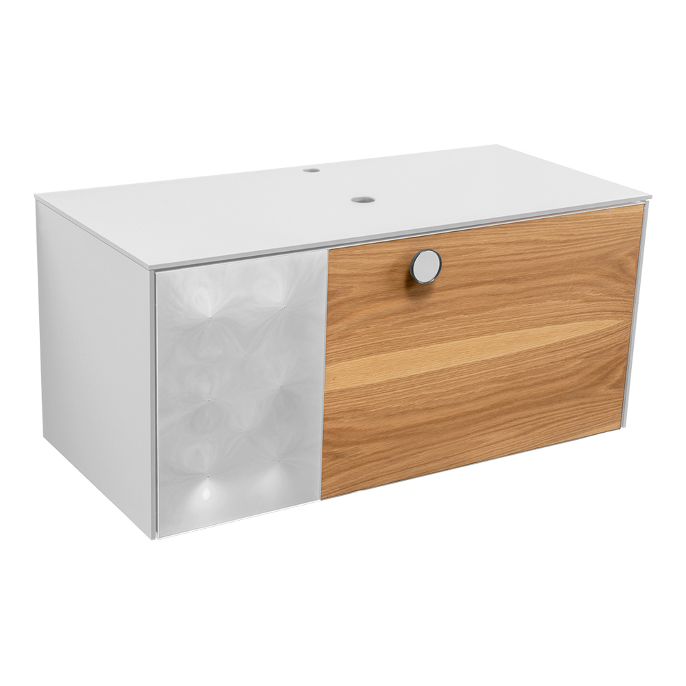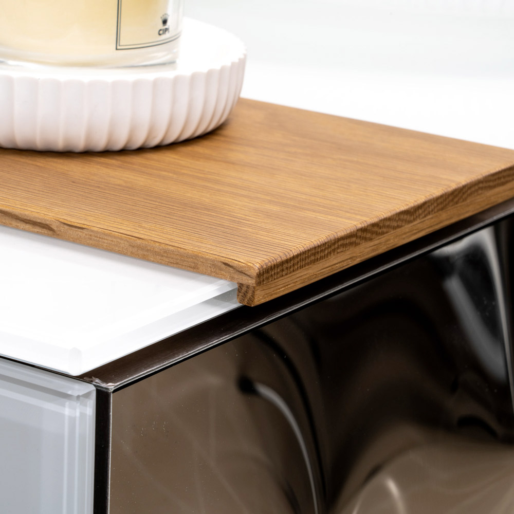 الجزء المركزي من الخشب الطبيعي ذو الحبوب المرئية يتناغم بتناغم مع الجزء العلوي والجوانب المصنوعة من زجاج ملون فائق النقاء بسمك 8 مم . أما الجزء الجانبي من الدرج فهو زجاج منحني ، يتميز بتأثير ثلاثي الأبعاد مع انعكاسات مضيئة، مما يُثري التصميم بتفاصيل مميزة وراقية.
