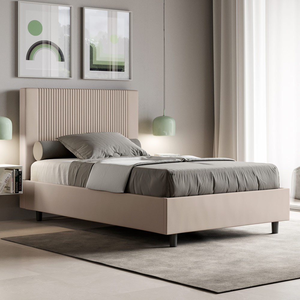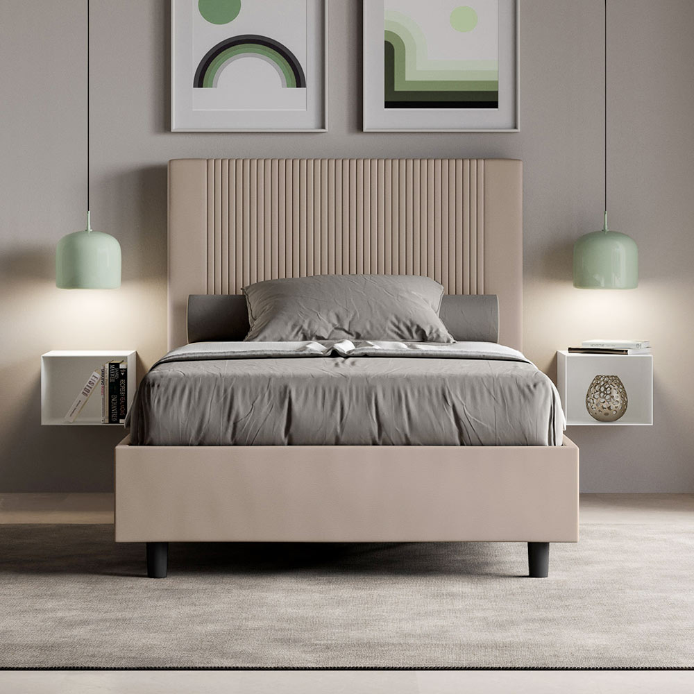 سرير فرنسي 140x200 سم مبطن مصنوع من ألواح الميلامين ومغطى بالجلد الصناعي ، صنع بالكامل في إيطاليا. هذا السرير الفرنسي، بإطاره المبطن، منتج إيطالي الصنع من الجلد الصناعي. تصميمه البسيط والعصري مثالي للمساحات التي تتميز بالأناقة الراقية. أبرز ما يميز هذا الطراز هو لوحه الأمامي المزخرف بخطوط عمودية ، وهو مثالي لمن يرغبون في دمجه مع مساحات لافتة للنظر بجدران بارزة، مع الحفاظ على أناقة لا تخطئها العين.