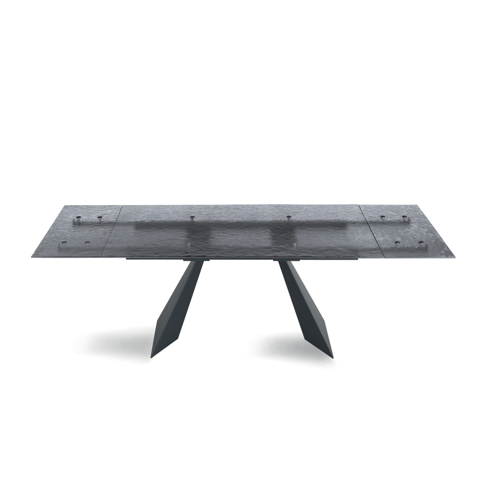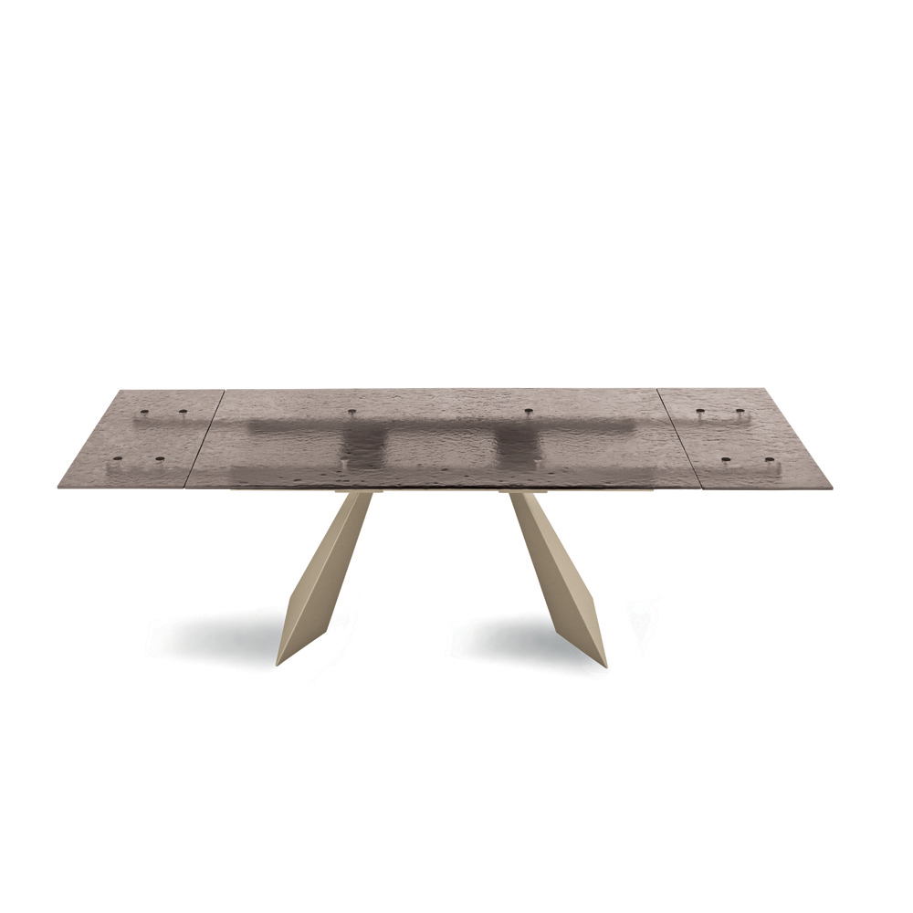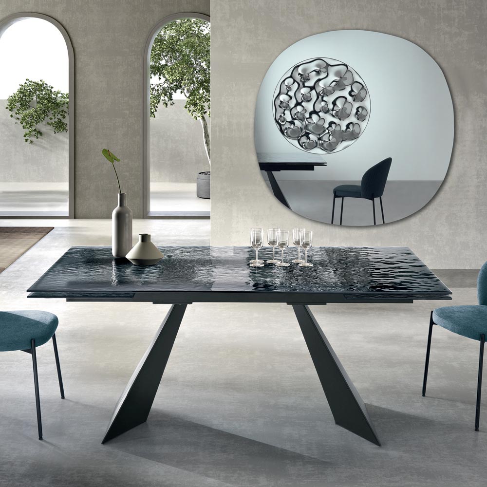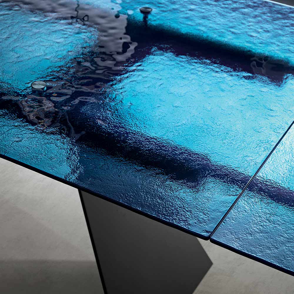 تمثل طاولة الطعام هذه تفسيراً مبتكراً للتصميم العصري، إذ تجمع بين مواد عالية الجودة وشكل فني آسر. سطح الطاولة، المصنوع من الزجاج المطروق ، تحفة فنية حقيقية: فكل تفاصيله تعكس الضوء بطريقة فريدة، مما يخلق تلاعباً بالانعكاسات والشفافية يضفي عمقاً وجاذبية بصرية على المكان.