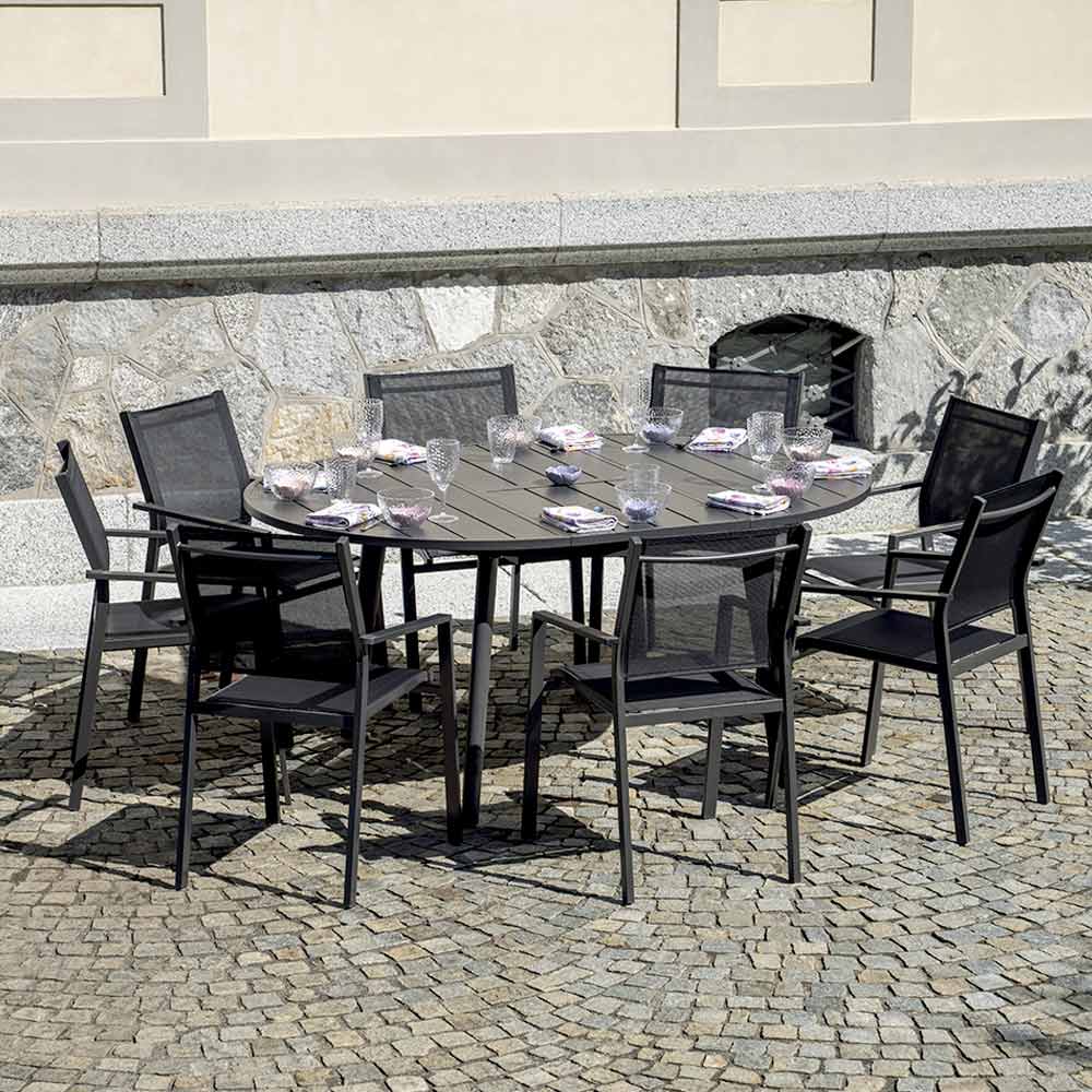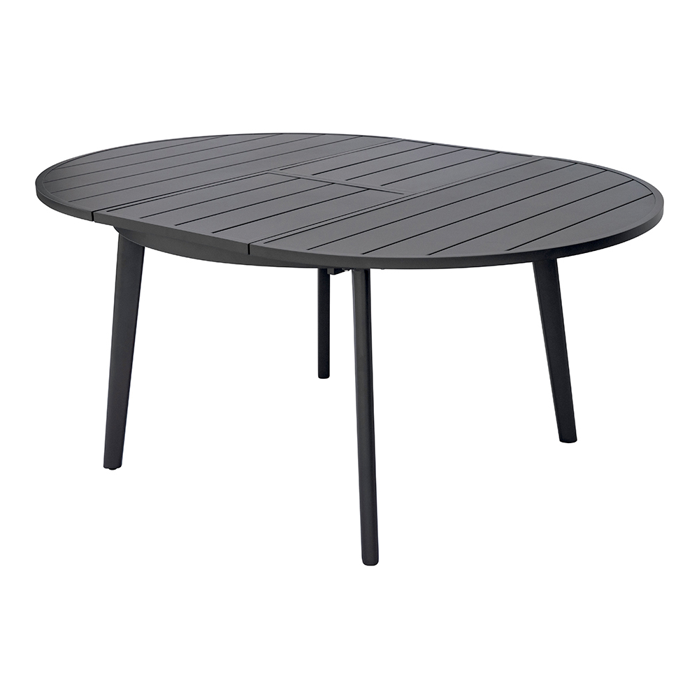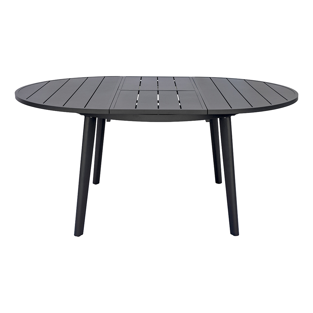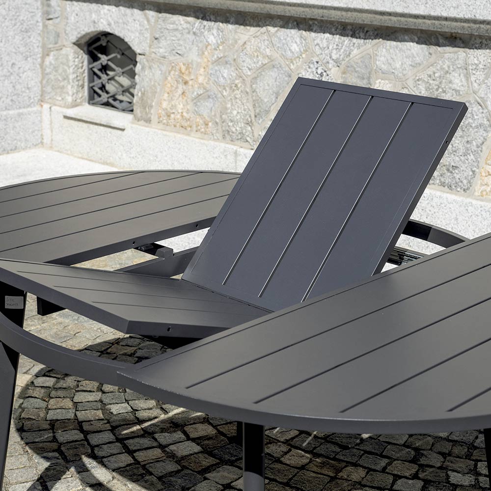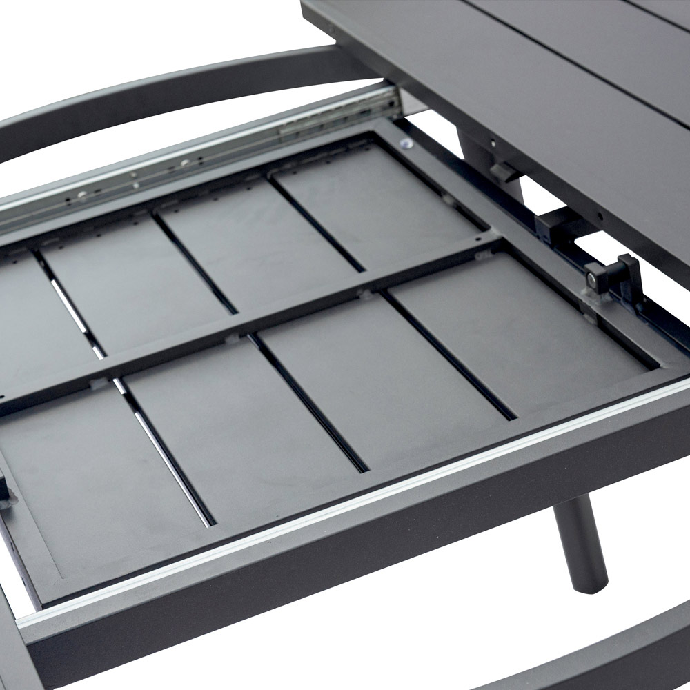 يضمن سطح الطاولة المصنوع من الألمنيوم بلون الأنثراسايت المتانة والمتانة، ويقاوم العوامل الجوية بكفاءة دون أن يفقد بريقه مع مرور الوقت. تُضفي الشرائح الأنيقة والمتساوية على الطاولة مظهرًا عصريًا راقيًا، بينما يضمن هيكلها الصلب ثباتها وخفة وزنها في آنٍ واحد.