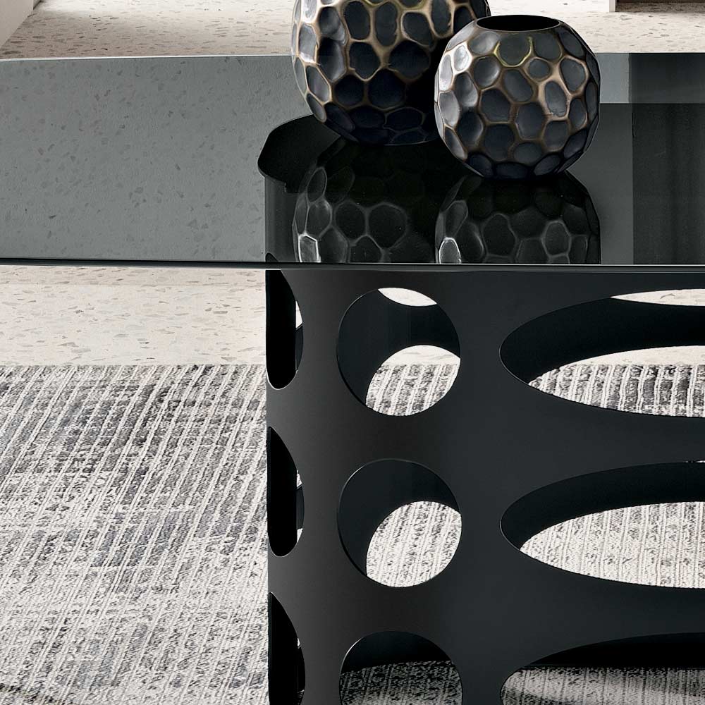 يُضفي سطح الطاولة الزجاجي الأملس ذو اللون المدخن إشراقًا وخفة بصرية على هيكلها، مما يُعزز تصميمها العصري. كما تُبرز شفافية الزجاج القاعدة المزخرفة، محولةً إياها إلى عنصر تصميمي لافت للنظر حقًا.