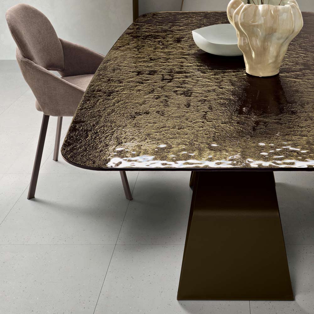 يخلق الجمع بين الزجاج المشغول والقاعدة المعدنية المنحوتة توازناً مثالياً بين الخفة والصلابة، مما يجعل هذه الطاولة مثالية للبيئات الحديثة والمتطورة حيث يحتل التصميم مركز الصدارة.