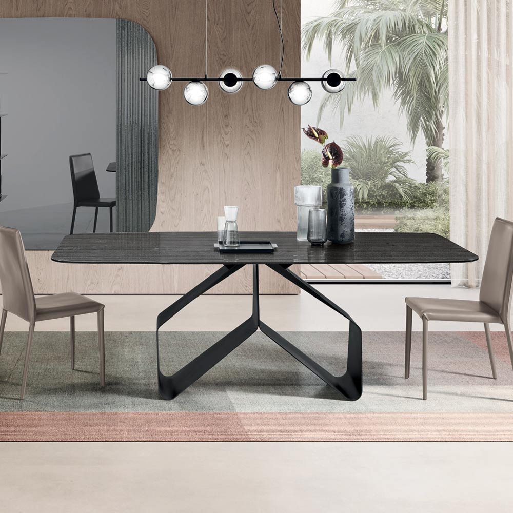طاولة طعام أنيقة بتصميم إيطالي فاخر، مصممة لتضفي لمسة جمالية راقية على غرفة الطعام أو غرفة المعيشة . تتميز الطاولة بقاعدتها المعدنية المطلية الأصلية، والتي تحمل هيكلاً رسومياً خفيفاً وديناميكياً يُشبه جناحين أنيقين، مما يخلق تأثيراً جمالياً قوياً مع الحفاظ على توازن بصري رائع.