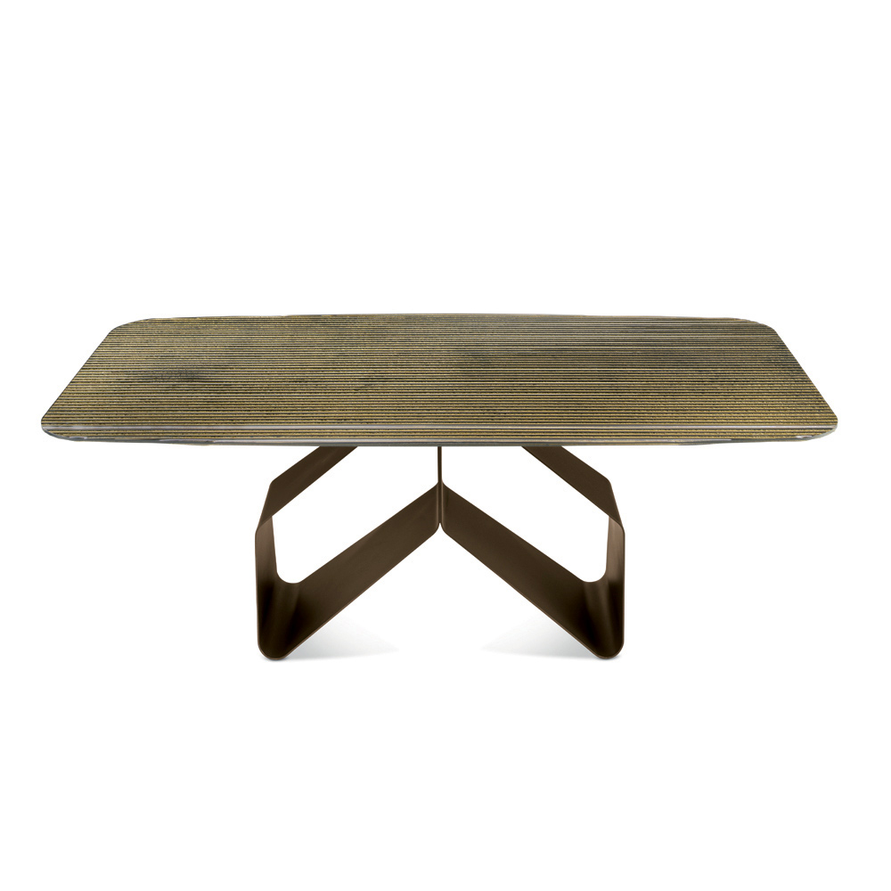 يخلق الجمع بين الزجاج المشغول والقاعدة المعدنية المنحوتة توازناً مثالياً بين الخفة والصلابة، مما يجعل هذه الطاولة مثالية للبيئات الحديثة والمتطورة حيث يحتل التصميم مركز الصدارة.