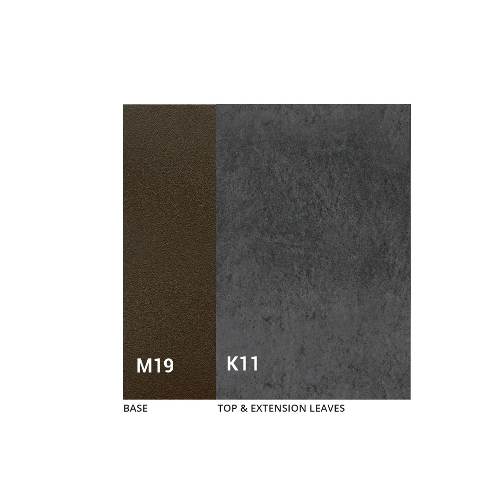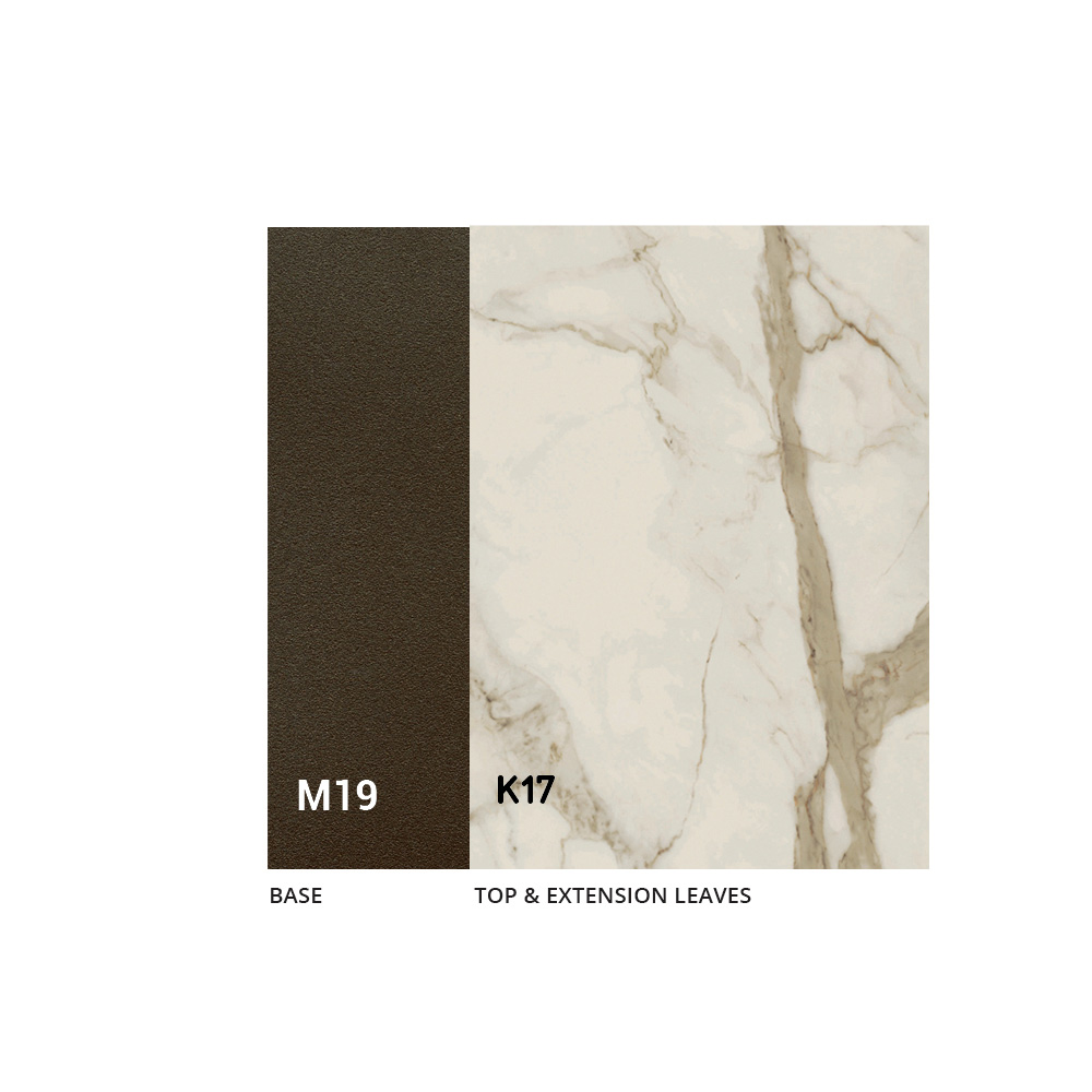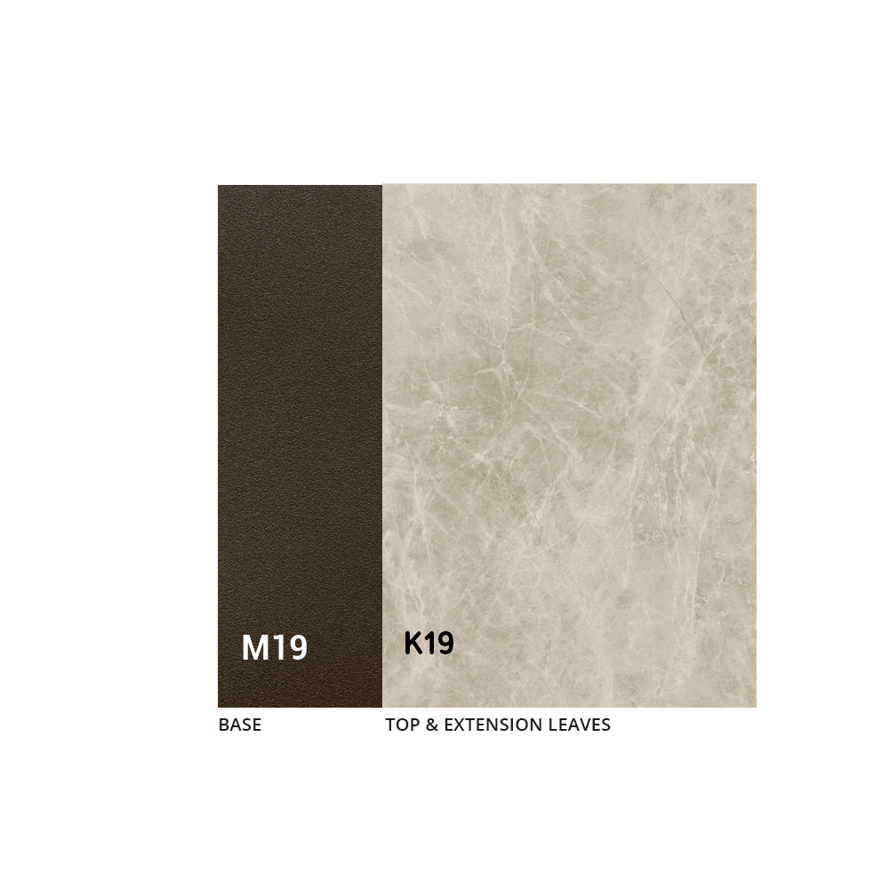 طاولة مصنوعة من قاعدة معدنية مطلية باللون البرونزي المنقوش وسطح من السيراميك بسمك 3 مم. الجزء العلوي قابل للتمديد بإطار معدني وآلية تلسكوبية وفتحة متزامنة. يمتد الامتداد الداخلي ككتاب، ويمتد بحبيبات متواصلة.