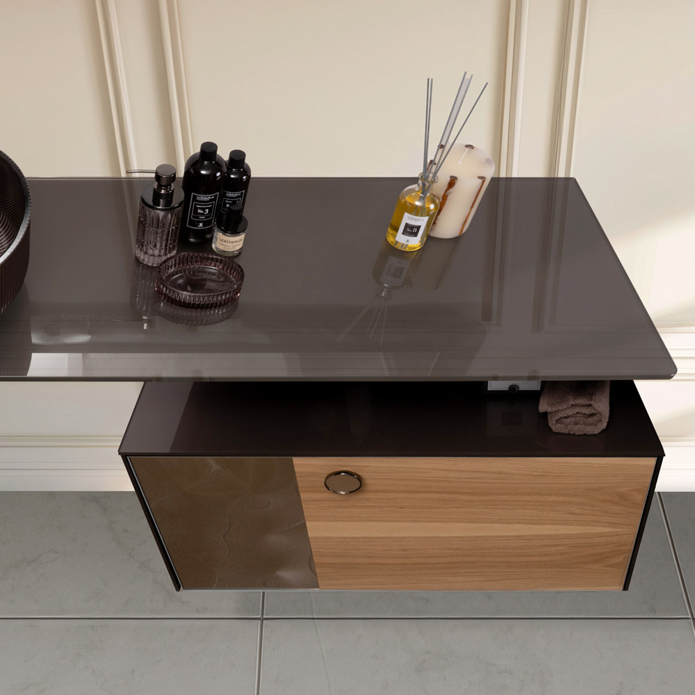 الجزء المركزي من الخشب الطبيعي ذو الحبوب المرئية يتناغم بتناغم مع الجزء العلوي والجوانب المصنوعة من زجاج ملون فائق النقاء بسمك 8 مم . أما الجزء الجانبي من الدرج فهو زجاج منحني ، يتميز بتأثير ثلاثي الأبعاد مع انعكاسات مضيئة، مما يُثري التصميم بتفاصيل مميزة وراقية.
