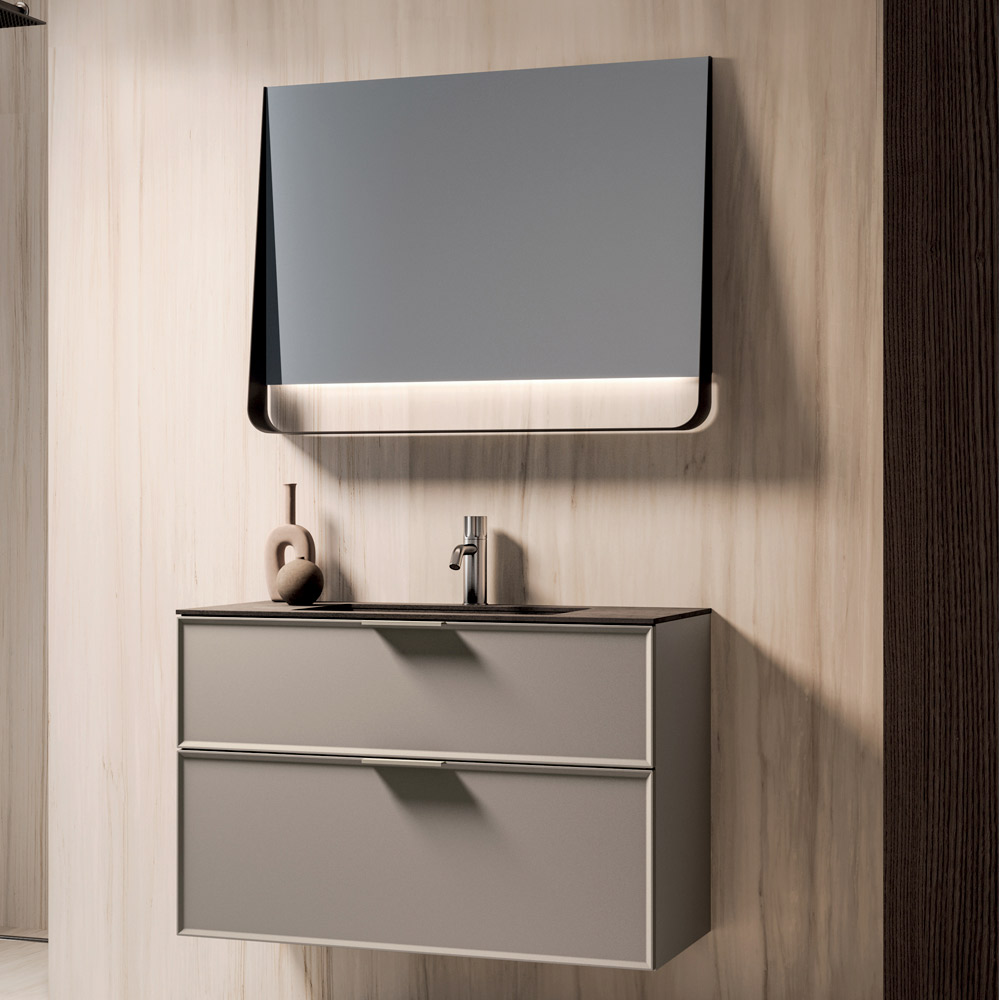 وتكتمل التركيبة بمرآة Wing LED ذات الإطار الأسود غير اللامع، المصممة لتوفير إضاءة موحدة وعملية، وهي مثالية لمنطقة الحوض ولتحسين الراحة البصرية.