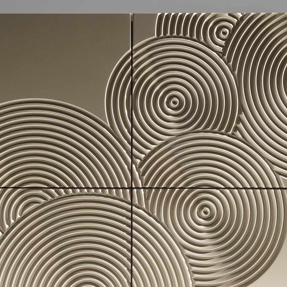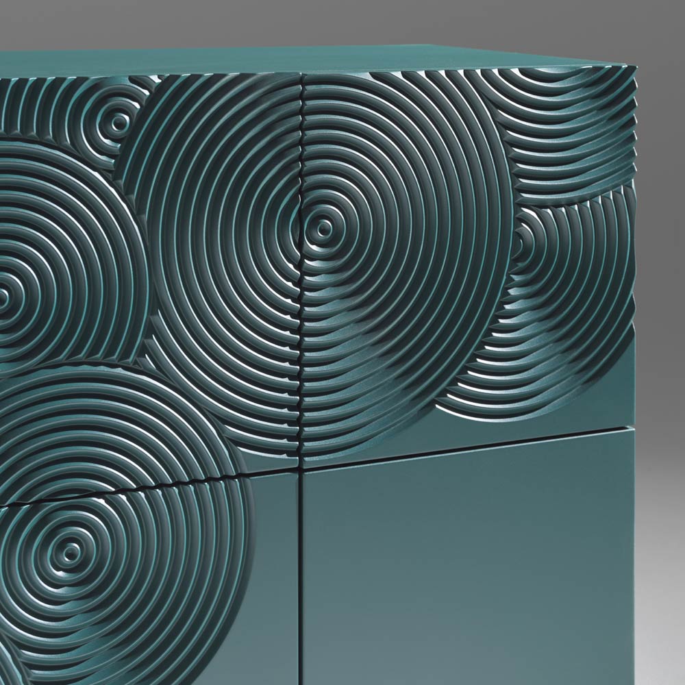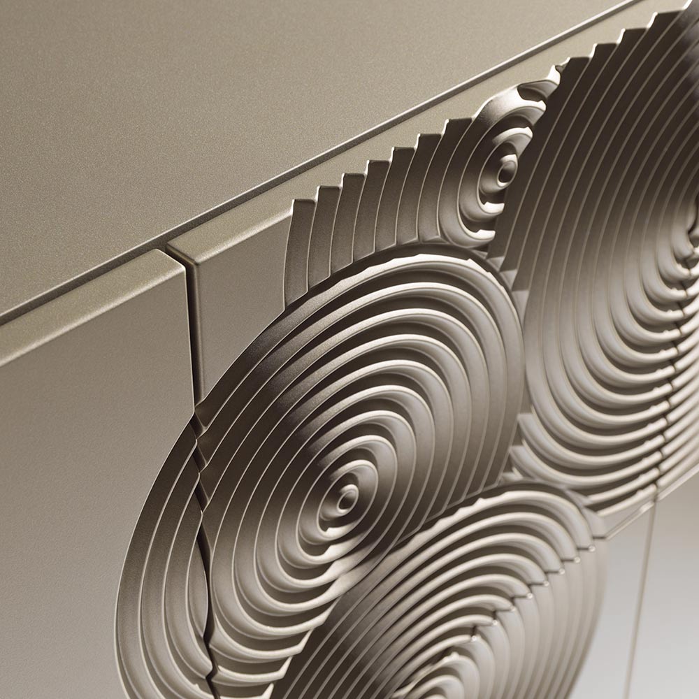خزانة جانبية ذات تأثير بصري قوي، تتميز بزخرفة راقية محفورة بنمط دائري ومصقولة بالكامل يدويًا ، قادرة على خلق تلاعبات موحية بالضوء والظل على السطح.