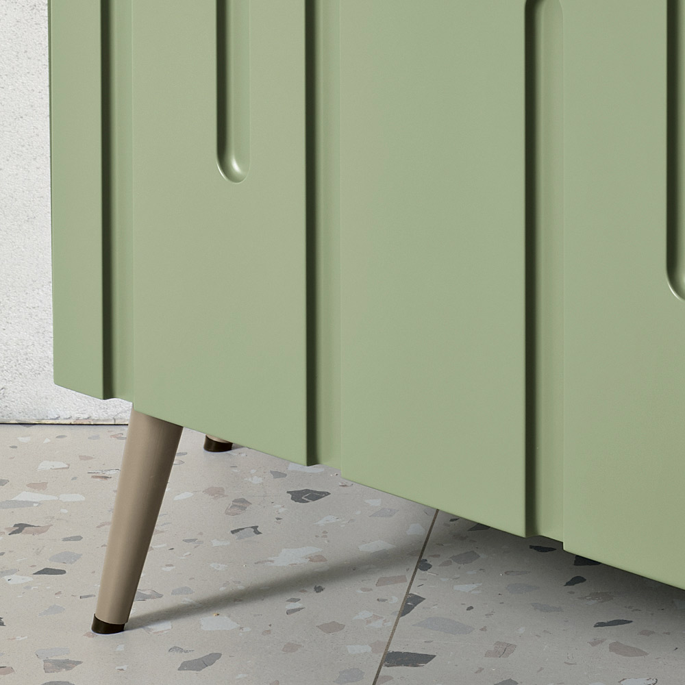 تتميز أبواب MDF المطلية بمادة PVC بنقوش عمودية غير منتظمة تحاكي التدفق الطبيعي للصواعد والهوابط ، مما يخلق تأثيرًا راقيًا وملمسًا مميزًا وديناميكيًا. يضفي هذا التفاعل بين النقوش عمقًا وحركة على السطح، مما يعزز الإضاءة ويجعل الخزانة الجانبية محورًا رئيسيًا في المكان.