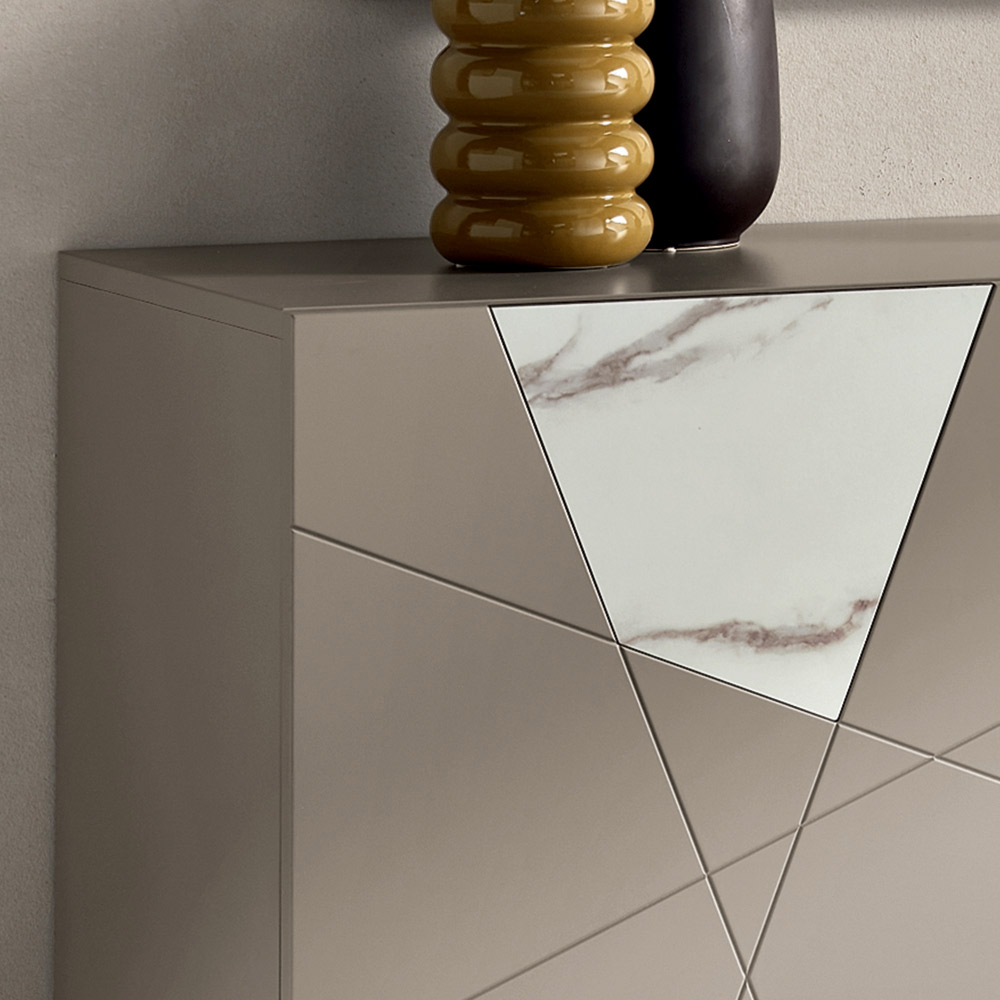 يتكون الهيكل من إطار خشبي مغطى بالميلامين وأبواب من خشب MDF محفورة بنقوش متداخلة بتصميم هندسي أنيق. وتُضفي حشوات الزجاج ذات المظهر الرخامي لمسة جمالية على السطح، مما يخلق تناغمًا راقيًا بين الرسومات والمواد.