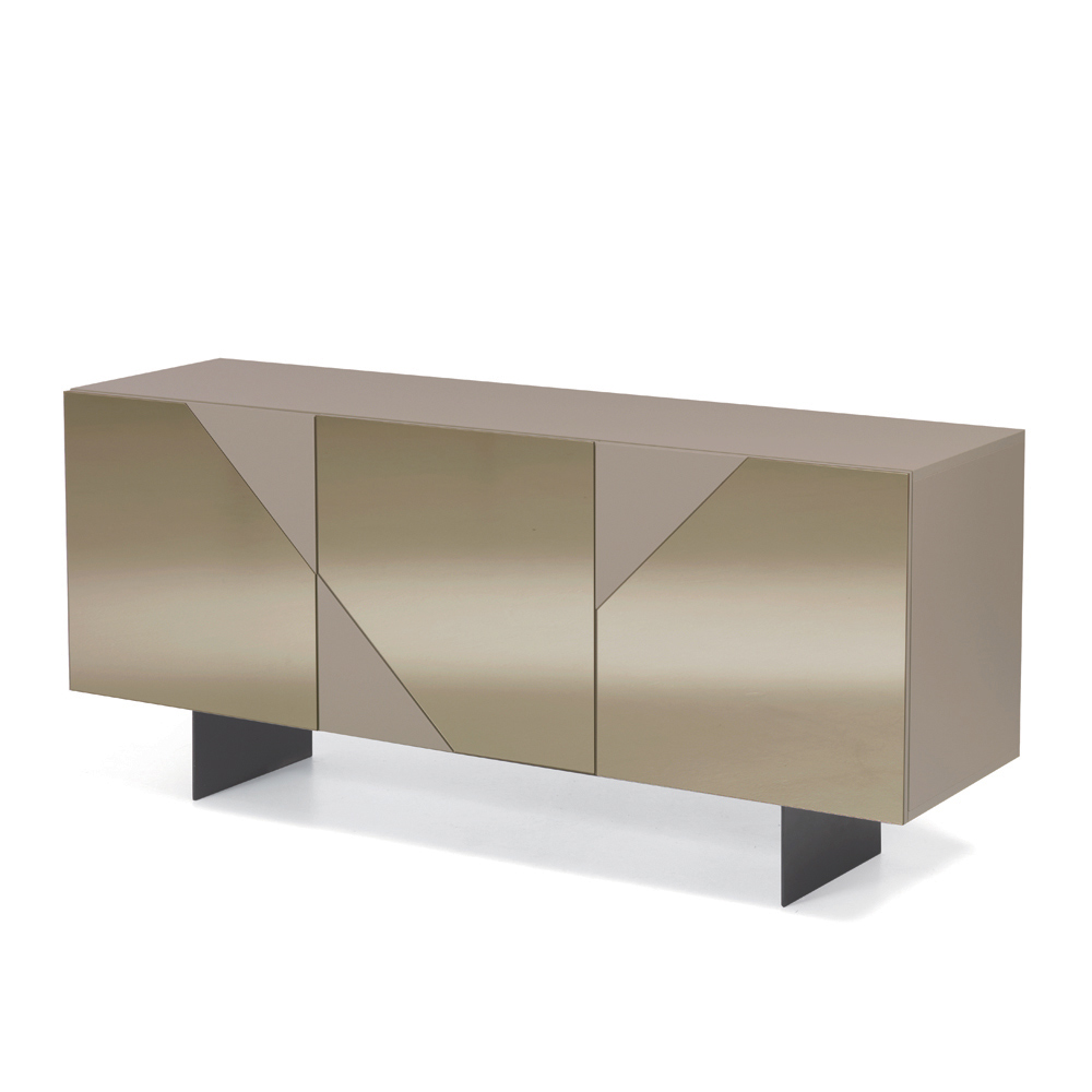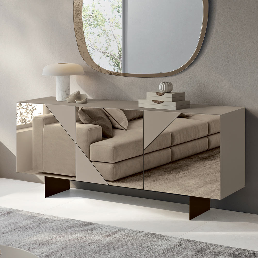 أبواب MDF مغطاة بزجاج عاكس يتناوب بين الأسطح اللامعة والمطفية ، مما يخلق تداخلاً هندسياً أنيقاً يعكس الضوء ويضفي عمقاً بصرياً. هذا التباين في المواد يجعل الخزانة الجانبية أنيقة وديناميكية، مثالية للمساحات العصرية والراقية.